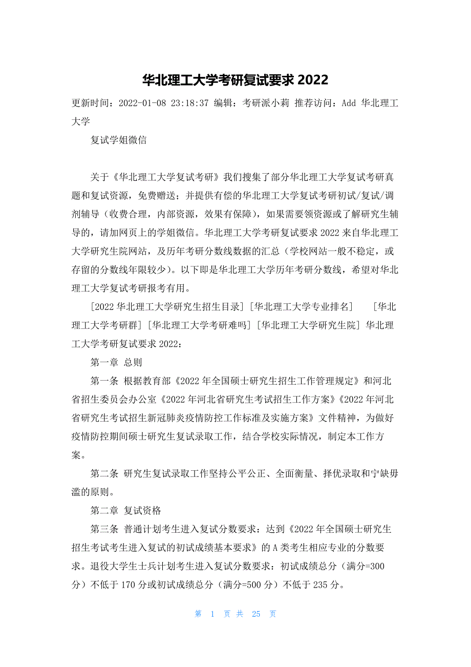 华北理工大学考研复试要求2022更新时间:2022-01-08 23:18:37 编辑:考研派小莉 推荐访问:Add 华北理工大学 复试学姐 关于《华北理工大学复试考研》我们搜集了部分华北理工大学复试考研真题和复试资源,免费赠送;并提供有偿的华北理工大学复试考研初试/复试/调剂(收费合理,内部资源,效果有保障),如果需要领资源或了解研究生的,请加网页上的学姐华北理工大学考研复试要求2022来自华北理工大学研究生院网站,及历年考研分数线数据的汇总(学校网站一般不稳定,或存留的分数线年限较少)以下即是华北理工大学历年考研分数线,希望对华北理工大学复试考研报考有用 [2022华北理工大学研究生招生目录] [华北理工大学专业排名] [华北理工大学考研群] [华北理工大学考研难吗] [华北理工大学研究生院] 华北理工大学考研复试要求2022: 第一章 总则 第一条 根据教育部《2022年全国硕士研究生招生工作管理规定》和河北省招生委员会办公室《2022年河北省研究生考试招生工作方案》《2022年河北省研究生考试招生新冠肺炎疫情防控工作标准及实施方案》文件精神,为做好疫情防控期间硕士研究生复试录取工作,结合学校实际情况,制定本工作方案。