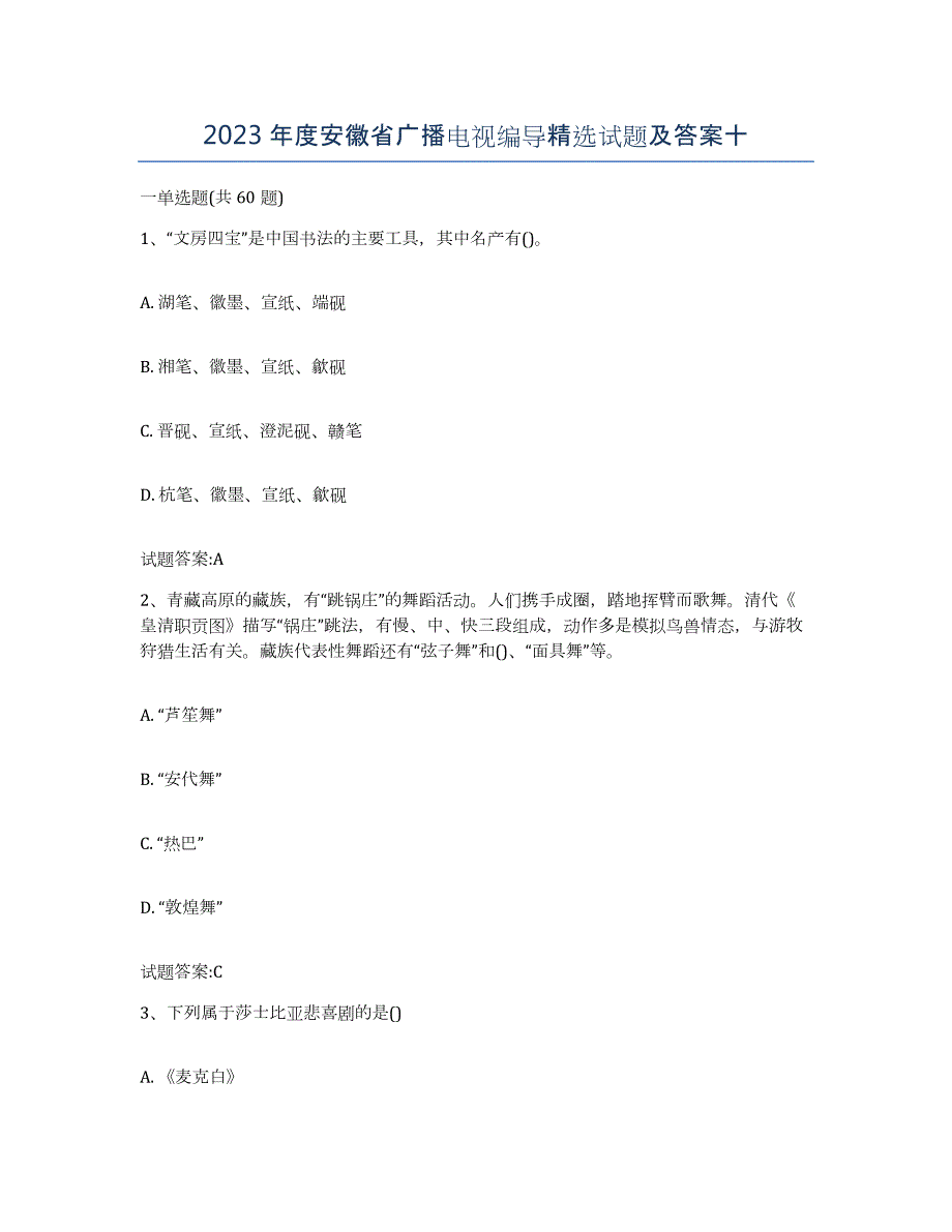 2023年度安徽省广播电视编导精选试题及答案十一单选题(共60题)1、“文房四宝”是中国书法的主要工具,其中名产有() A. 湖笔、徽墨、宣纸、端砚 B. 湘笔、徽墨、宣纸、歙砚 C. 晋砚、宣纸、澄泥砚、赣笔 D. 杭笔、徽墨、宣纸、歙砚 试题答案:A 2、青藏高原的藏族,有“跳锅庄”的舞蹈活动人们携手成圈,踏地挥臂而歌舞清代《皇清职贡图》描写“锅庄”跳法,有慢、中、快三段组成,动作多是模拟鸟兽情态,与游牧狩猎生活有关藏族代表性舞蹈还有“弦子舞”和()、“面具舞”等 A. “芦笙舞” B. “安代舞” C. “热巴” D. “敦煌舞” 试题答案:C 3、下列属于莎士比亚悲喜剧的是() A. 《麦克白》 B. 《李尔王》 C. 《冬天的故事》 D. 《《奥赛罗》 试题答案:C 4、电视剧《潜伏》的编剧是() A. 麦加 B. 兰晓龙 C. 石康 D. 姜伟 试题答案:D 5、下列有错别字的一个成语是() A. 安帮定国 B. 不胫而走 C. 草菅人命 D. 不省人事 试题答案:A 6、汉武帝是指() A. 刘彻 B. 刘启 C. 刘恒 D. 刘秀 试题答案:A 7、塑造“二诸葛”这一人物形象的作家是() A. 丁玲 B. 赵树理 C. 曹禺 D. 孙犁 试题答案:B 8、我国古代最长的抒情诗是() A. 《离骚》 B. 《孔雀东南飞》 C. 《木兰诗》 D. 《圆圆曲》 试题答案:A 9、下列修辞运用得当的一项是() A. 哦~我突然感觉到,我是看到了一个更是巴金的巴金。
