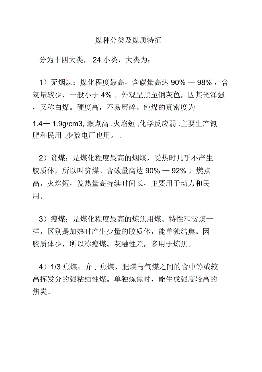 煤种分类及煤质特征分为十四大类, 24 小类,大类为:1)无烟煤:煤化程度最高,含碳量高达 90% — 98% ,含氢量较少,一般小于 4% 外观呈黑至钢灰色,因其光泽强,又称白煤硬度高,不易磨碎纯煤的真密度为1.4— 1.9g/cm3, 燃点高 ,火焰短 ,化学反应弱 .主要生产氮肥和民用 ,少数电厂也用 .2)贫煤:是煤化程度最高的烟煤,受热时几乎不产生胶质体,所以叫贫煤含碳量高达 90% — 92% ,燃点高,火焰短,发热量高持续时间长,主要用于动力和民用3)瘦煤:是煤化程度最高的炼焦用煤特性和贫煤一样,区别是加热时产生少量的胶质体,能单独结焦因胶质体少,所以称瘦煤灰融性差,多用于炼焦4)1/3 焦煤:介于焦煤、肥煤与气煤之间的含中等或较高挥发分的强粘结性煤单独炼焦时,能生成强度较高的焦炭5)气肥煤:挥发分高、粘结性强的烟煤单独炼焦时,能产生大量的煤气和胶质体,但不能生成强度高的焦炭6)1/2 中粘煤:粘结性介于气煤和弱粘煤之间的、挥发分范围较宽的烟煤7)贫瘦煤:变质程度高,粘结性较差、挥发分低的烟煤结焦性低于瘦煤8)焦煤:是结焦性最好的炼焦煤,也称主焦煤中等挥发分,一般大于 18% — 30% ,大多能单独炼焦。