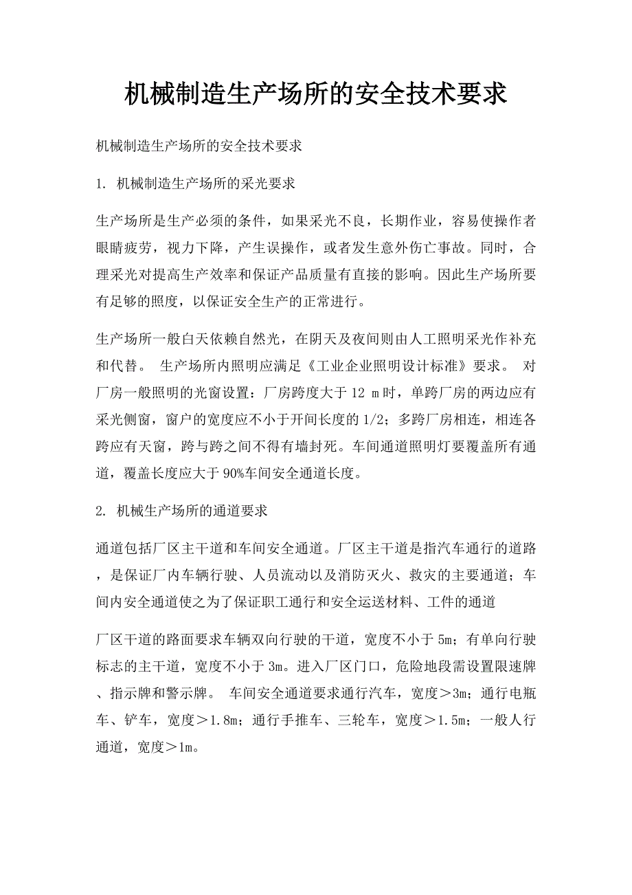 机械制造生产场所的安全技术要求机械制造生产场所的安全技术要求 1. 机械制造生产场所的采光要求 生产场所是生产必须的条件,如果采光不良,长期作业,容易使操作者眼睛疲劳,视力下降,产生误操作,或者发生意外伤亡事故同时,合理采光对提高生产效率和保证产品质量有直接的影响因此生产场所要有足够的照度,以保证安全生产的正常进行 生产场所一般白天依赖自然光,在阴天及夜间则由人工照明采光作补充和代替 生产场所内照明应满足《工业企业照明设计标准》要求 对厂房一般照明的光窗设置:厂房跨度大于12 m时,单跨厂房的两边应有采光侧窗,窗户的宽度应不小于开间长度的1/2;多跨厂房相连,相连各跨应有天窗,跨与跨之间不得有墙封死车间通道照明灯要覆盖所有通道,覆盖长度应大于90%车间安全通道长度 2. 机械生产场所的通道要求 通道包括厂区主干道和车间安全通道厂区主干道是指汽车通行的道路,是保证厂内车辆行驶、人员流动以及消防灭火、救灾的主要通道;车间内安全通道使之为了保证职工通行和安全运送材料、工件的通道 厂区干道的路面要求车辆双向行驶的干道,宽度不小于5m;有单向行驶标志的主干道,宽度不小于3m进入厂区门口,危险地段需设置限速牌、指示牌和警示牌。