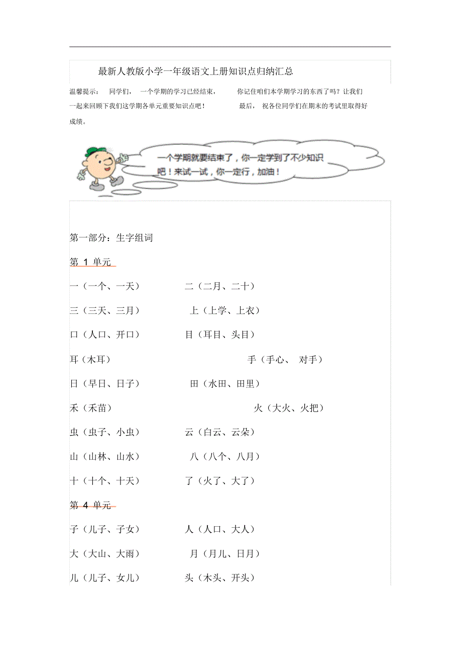 最新人教版小学一年级语文上册知识点归纳汇总温馨提示:同学们, 一个学期的学习已经结束,你记住咱们本学期学习的东西了吗?让我们一起来回顾下我们这学期各单元重要知识点吧!最后, 祝各位同学们在期末的考试里取得好成绩第一部分:生字组词第 1 单元一(一个、一天)二(二月、二十)三(三天、三月)上(上学、上衣)口(人口、开口)目(耳目、头目)耳(木耳)手(手心、 对手)日(早日、日子)田(水田、田里)禾(禾苗)火(大火、火把)虫(虫子、小虫)云(白云、云朵)山(山林、山水)八(八个、八月)十(十个、十天)了(火了、大了)第 4 单元子(儿子、子女)人(人口、大人)大(大山、大雨)月(月儿、日月)儿(儿子、女儿)头(木头、开头)里(里头、山里)可(可是、可口)东(东西、山东)西(西瓜、山西)天(白天、半天)四(四个、四十)是(是的、不是)女(女儿、子女)开(开水、开心)第 5 单元水(水牛、开水)去(上去、来去)来(本来、下来)不(不好、不是)小(大小、小手)少(多少、少见)牛(水牛、小牛)果(果子、水果)鸟(鸟儿、小鸟)早(早上、早日)书(书本、书包)刀(小刀、刀口)尺(尺子)本(书本、 本子)木(木头、木耳)林(山林、竹林)土(水土、土木)力(有力、用力)心(开心、小心)中(中心、中午)五(五十、五月)立(立正、自立)正(正在、正好)在(正在、不在)第 6 单元后(后来、后天)我(我们、自我)好(好心、好人)长(长江、长沙)比(正比、对比)巴(下巴、巴士)把(把手、火把)下(下来、下午)个(一个、个人)雨(雨衣、下雨)们(我们、人们)问(问好、学问)有(有心、有力)半(一半、半天)从(从来、从不)你(你好、你们)第 7 单元才(人才、天才)明(明天、明白)同(同学、不同)学(上学、小学)自(自立、自我)己(自己、知己)衣(上衣、雨衣)白(白云、白天)的(有的、好的)又(又大又红)和(和好、不和)第 8 单元竹(竹子、竹林)牙(月牙、门牙)马(马上、木马)用(用心、有用)几(几个、几月)只(一只)石(石头、石子)多(多少、好多)出(出去、日出)见(只见、少见)对(对手、对比)妈(妈妈、大妈)全(全天、全力)回(回来、回去)工(工人、手工)厂(工厂、厂长)第二部分:读读说说1、词语搭配弯弯的月儿小小的船闪闪的星星蓝蓝的天高高的树尖尖的草芽圆圆的荷叶弯弯的谷穗白白的云绿绿的草黄黄的沙滩雪白的浪花彩色的项链长长的尾巴金色的沙子雪白的云朵快活的小鸟小小的贝壳2、数量词一 ( 头) 黄牛一 ( 只) 猫一 ( 群 ) 鸭子一 ( 只) 鸟一 ( 个) 苹果一( 颗 ) 枣一 ( 堆) 杏子一 ( 个 ) 桃一 ( 朵 ) 白云一 ( 根) 头一 ( 双 ) 手一 ( 条 ) 鱼一 ( 颗) 星星一 ( 把 ) 刀一 ( 把 ) 伞一 ( 块) 黑板一 ( 朵 ) 花一 ( 本 ) 书一 ( 棵) 树一 ( 把 ) 尺子3、又⋯⋯又⋯⋯绳子又细又长西瓜又大又圆弟弟又白又胖果子又多又好大海又宽又远房子又高又大苹果又大又红沙滩又长又软星星又多又亮4、⋯⋯像⋯⋯弯弯的月儿像小船。