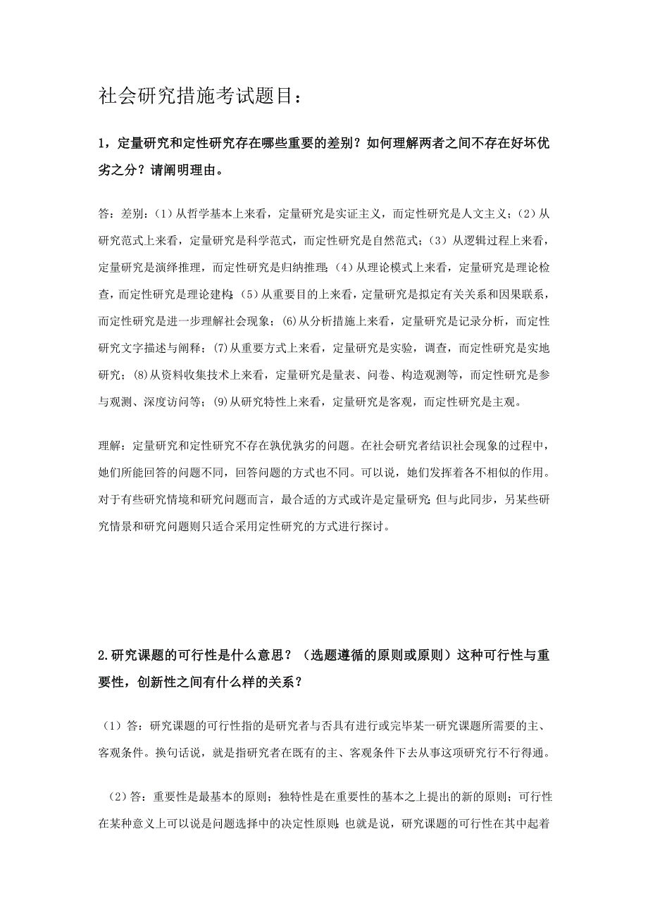 社会研究措施考试题目:1,定量研究和定性研究存在哪些重要的差别?如何理解两者之间不存在好坏优劣之分?请阐明理由答:差别:(1)从哲学基本上来看,定量研究是实证主义,而定性研究是人文主义;(2)从研究范式上来看,定量研究是科学范式,而定性研究是自然范式;(3)从逻辑过程上来看,定量研究是演绎推理,而定性研究是归纳推理;(4)从理论模式上来看,定量研究是理论检查,而定性研究是理论建构;(5)从重要目的上来看,定量研究是拟定有关关系和因果联系,而定性研究是进一步理解社会现象;(6)从分析措施上来看,定量研究是记录分析,而定性研究文字描述与阐释;(7)从重要方式上来看,定量研究是实验,调查,而定性研究是实地研究;(8)从资料收集技术上来看,定量研究是量表、问卷、构造观测等,而定性研究是参与观测、深度访问等;(9)从研究特性上来看,定量研究是客观,而定性研究是主观理解:定量研究和定性研究不存在孰优孰劣的问题在社会研究者结识社会现象的过程中,她们所能回答的问题不同,回答问题的方式也不同可以说,她们发挥着各不相似的作用对于有些研究情境和研究问题而言,最合适的方式或许是定量研究;但与此同步,另某些研究情景和研究问题则只适合采用定性研究的方式进行探讨。