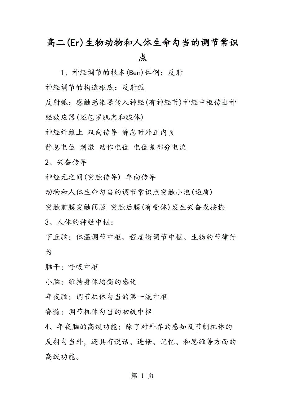 高二(Er)生物动物和人体生命勾当的调节常识点 1、神经调节的根本(Ben)体例:反射神经调节的构造根底:反射弧反射弧:感触感染器传入神经(有神经节)神经中枢传出神经效应器(还包罗肌肉和腺体)神经纤维上 双向传导 静息时外正内负静息电位 刺激 动作电位 电位差部分电流2、兴奋传导神经元之间(突触传导) 单向传导动物和人体生命勾当的调节常识点突触小泡(递质) 突触前膜突触间隙 突触后膜(有受体)发生兴奋或按捺3、人体的神经中枢:下丘脑:体温调节中枢、程度衡调节中枢、生物的节律行为脑干:呼吸中枢小脑:维持身体均衡的感化年夜脑:调节机体勾当的第一流中枢脊髓:调节机体勾当的初级中枢4、年夜脑的高级功能:除了对外界的感知及节制机体的反射勾当外,还具有说话、进修、记忆、和思维等方面的高级功能年夜脑S区受损会得活动性掉语症:患(Huan)者可以看懂文字、听懂别人措辞、但本身不会讲话5、激素(Su)调节:由内排泄器官(或细胞)排泄的化学物质进展调节激素调节是体液调节的首要内容,体液调节还有CO2的调节6、人体正常血糖浓度;0.81.2g/L低于0.8 g/L:低血糖症 高于1.2 g/L;高血糖症、严重时呈现糖尿病。