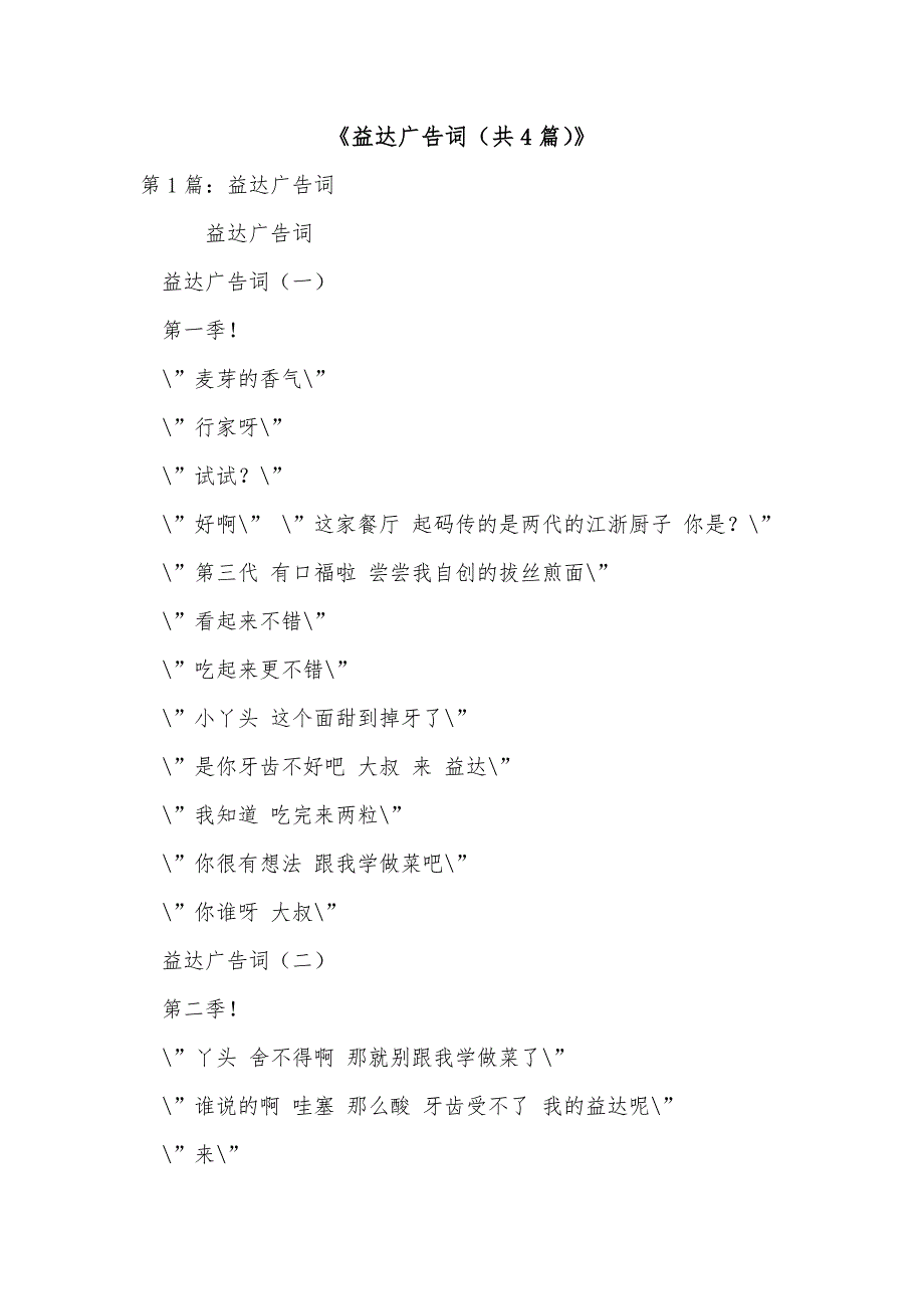 《益达广告词(共4篇)》第1篇:益达广告词 益达广告词益达广告词(一)第一季!\”麦芽的香气\”\”行家呀\”\”试试?\”\”好啊\” \”这家餐厅 起码传的是两代的江浙厨子 你是?\”\”第三代 有口福啦 尝尝我自创的拔丝煎面\”\”看起来不错\”\”吃起来更不错\”\”小丫头 这个面甜到掉牙了\”\”是你牙齿不好吧 大叔 来 益达\”\”我知道 吃完来两粒\”\”你很有想法 跟我学做菜吧\”\”你谁呀 大叔\”益达广告词(二)第二季!\”丫头 舍不得啊 那就别跟我学做菜了\”\”谁说的啊 哇塞 那么酸 牙齿受不了 我的益达呢\”\”来\”\”大叔拿小包装 可爱哦\”\”小丫头背大包袱 何必呢 放下吧\”\”管那么多 管好怎么教我做菜吧\” ——文章来源网,仅供分享学习参考1 第2篇:益达广告词 益达广告词整理【提要】本篇《益达广告词_》由应届毕业生为需要广告作文素材的朋友精心收集整理,仅供参考内容如下:第一季!\”麦芽的香气\”\”行家呀\”\”试试?\”\”好啊\” \”这家餐厅 起码传的是两代的江浙厨子 你是?\”\”第三代 有口福啦 尝尝我自创的拔丝煎面\”\”看起来不错\”\”吃起来更不错\”\”小丫头 这个面甜到掉牙了\”\”是你牙齿不好吧 大叔 来 益达\”\”我知道 吃完来两粒\”\”你很有想法 跟我学做菜吧\”\”你谁呀 大叔\”益达广告词第二季!\”丫头 舍不得啊 那就别跟我学做菜了\”\”谁说的啊 哇塞 那么酸 牙齿受不了 我的益达呢\”\”来\”\”大叔拿小包装 可爱哦\”(.)\”小丫头背大包袱 何必呢 放下吧\”\”管那么多 管好怎么教我做菜吧\” 第3篇:益达广告词 第一段A:嘿,B:嘿,A:这么晚才下班啊? B:是啊。