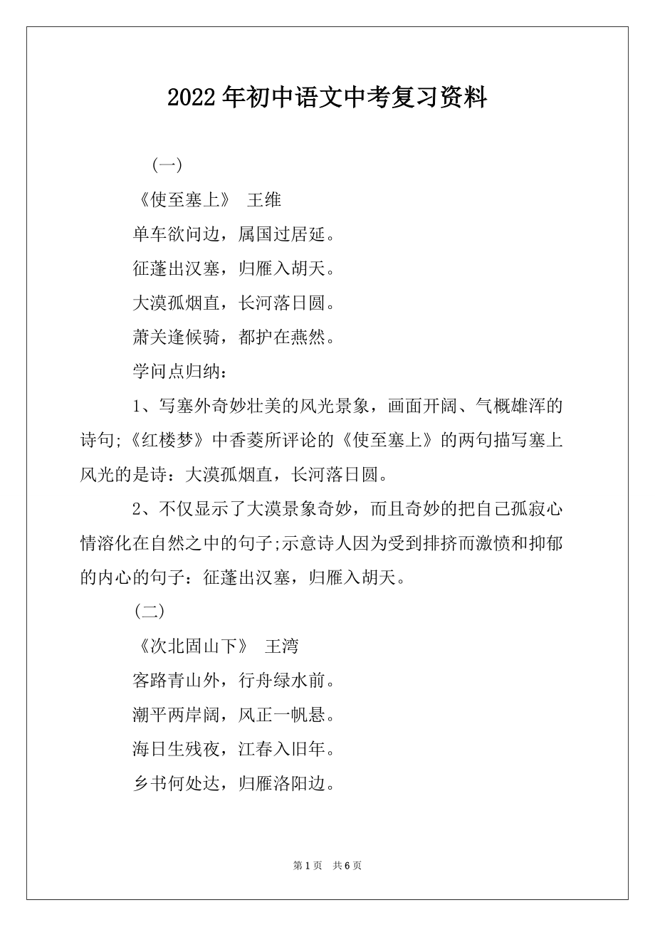 2022年初中语文中考复习资料 (一) 《使至塞上》 王维 单车欲问边,属国过居延 征蓬出汉塞,归雁入胡天 大漠孤烟直,长河落日圆 萧关逢候骑,都护在燕然 学问点归纳: 1、写塞外奇妙壮美的风光景象,画面开阔、气概雄浑的诗句;《红楼梦》中香菱所评论的《使至塞上》的两句描写塞上风光的是诗:大漠孤烟直,长河落日圆 2、不仅显示了大漠景象奇妙,而且奇妙的把自己孤寂心情溶化在自然之中的句子;示意诗人因为受到排挤而激愤和抑郁的内心的句子:征蓬出汉塞,归雁入胡天 (二) 《次北固山下》 王湾 客路青山外,行舟绿水前 潮平两岸阔,风正一帆悬 海日生残夜,江春入旧年 乡书何处达,归雁洛阳边 学问点归纳: 1、时序交替中的景物,示意着时间的的消逝,蕴含自然理趣的诗句;写岁末年初江边景色用来感叹岁月无情,徒增游子无限乡愁;蕴含新事物孕育于旧事物解体之时的哲理:海日生残夜,江春入旧年 2、表达乡愁之情的句子:乡书何处达,归雁洛阳边 3、首联写出了诗人怎样的思想感情 答:先写客路,后写行舟,写出了人在他乡、神驰故里的漂泊羁旅之情。