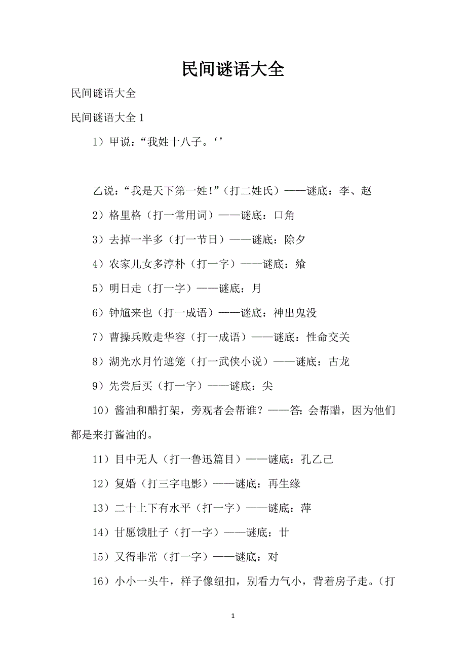 民间谜语大全民间谜语大全民间谜语大全11)甲说:“我姓十八子‘’乙说:“我是天下第一姓!”(打二姓氏)——谜底:李、赵2)格里格(打一常用词)——谜底:口角3)去掉一半多(打一节日)——谜底:除夕4)农家儿女多淳朴(打一字)——谜底:飨5)明日走(打一字)——谜底:月6)钟馗来也(打一成语)——谜底:神出鬼没7)曹操兵败走华容(打一成语)——谜底:性命交关8)湖光水月竹遮笼(打一武侠小说)——谜底:古龙9)先尝后买(打一字)——谜底:尖10)酱油和醋打架,旁观者会帮谁?——答:会帮醋,因为他们都是来打酱油的11)目中无人(打一鲁迅篇目)——谜底:孔乙己12)复婚(打三字电影)——谜底:再生缘13)二十上下有水(打一字)——谜底:萍14)甘愿饿肚子(打一字)——谜底:廿15)又得非常(打一字)——谜底:对16)小小一头牛,样子像纽扣,别看力气小,背着房子走打一动物)——谜底:蜗牛17)哈哈镜(打一成语)——谜底:相映成趣18)上海居民(打一字)——谜底:伸19)二人为股东(打一字)——谜底:役20)像猴无尾巴,身似黑铁塔,兽中最聪慧,擅长玩杂耍打一动物)——谜底:黑猩猩21)初生下来,细瘦长长;生了下来,明光明亮;往下跳,闹个不停;往上飞,无声无响。