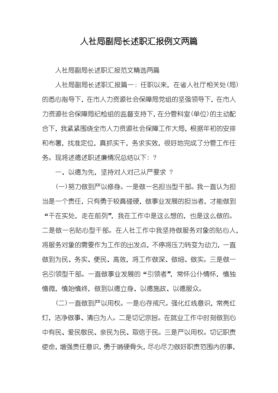 人社局副局长述职汇报例文两篇 人社局副局长述职汇报范文精选两篇 人社局副局长述职汇报篇一:任职以来,在省人社厅相关处(局)的悉心指导下,在市人力资源社会保障局党组的坚强领导下,在市人力资源社会保障局纪检组的监督支持下,在分管科室(单位)的主动配合下,我紧紧围绕全市人力资源社会保障工作大局,根据年初的安排和布署,找准定位,真抓实干,务求实效,很好地完成了分管工作任务现将述德述职述廉情况总结以下: ? 一、以德为先,坚持对人对己从严要求 ? (一)努力做到严以修身一是做一名担当型干部我一直认为担当是一个责任,只有勇于较真碰硬,做事业发展的担当者,才能做到“干在实处,走在前列”,我在工作中是这么想的,也是这么做的二是做一名贴心型干部在人社工作中我坚持做服务对象的贴心人,将服务对象的需要作为工作的出发点,不停将压力转变为动力,一直做到为民、务实、便民、高效,将工作做深、做细、做实三是做一名引领型干部一直做事业发展的“引领者”,常怀公仆情怀,慎独慎微,慎始慎终,做到以德立身、以德施政、以德服众 (二)一直做到严以用权一是心存戒尺强化红线意识,常亮红灯,洁净做事、清白为人二是切记宗旨在就业工作中时刻做到心中有民、爱民敬民、亲民为民、取信于民。