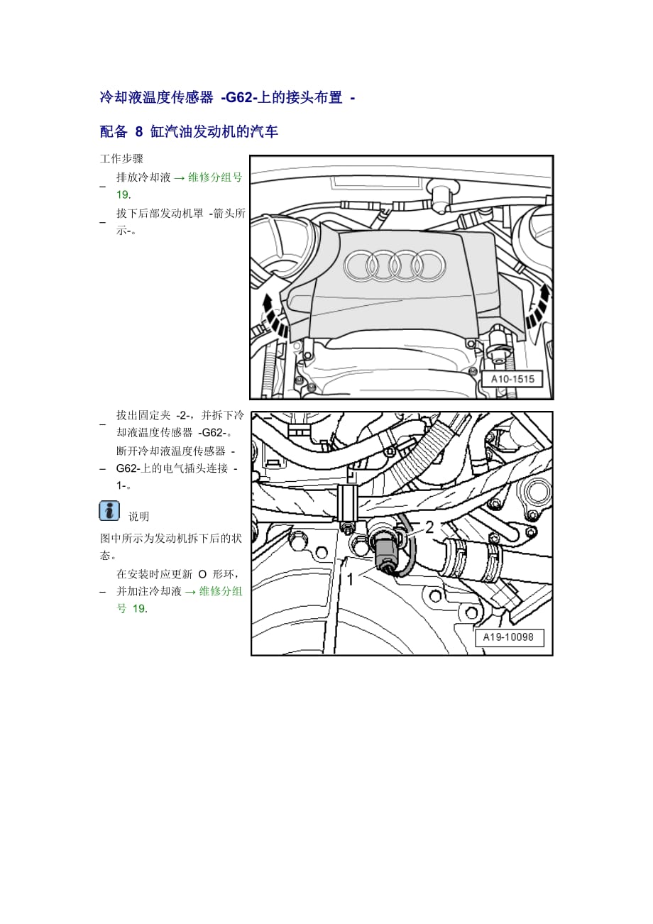 冷却液温度传感器 -G62-上的接头布置 - 配备 8 缸汽油发动机的汽车 工作步骤– 排放冷却液 →维修分组号 19.– 拔下后部发动机罩 -箭头所示- – 拔出固定夹 -2-,并拆下冷却液温度传感器 -G62-– 断开冷却液温度传感器 -G62-上的电气插头连接 -1- 说明图中所示为发动机拆下后的状态– 在安装时应更新 O 形环,并加注冷却液 →维修分组号 19. 冷却液温度传感器 -G62-上 2 芯插头连接的布置1-传感器接地2-从冷却液温度传感器 -G62-至发动机控制单元的导线连接 。