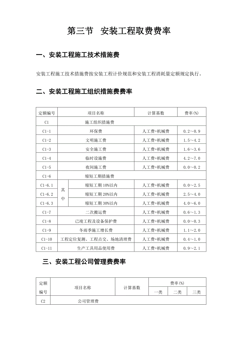 第三节 安装工程取费费率一、安装工程施工技术措施费安装工程施工技术措施费按安装工程计价规范和安装工程消耗量定额规定执行二、安装工程施工组织措施费费率定额编号项目名称计算基数费率(%)C1施工组织措施费C1-1环保费人工费+机械费0.2~0.9C1-2文明施工费人工费+机械费1.5~4.2C1-3安全施工费人工费+机械费1.6~3.6C1-4临时设施费人工费+机械费4.2~7.0C1-5夜间施工费人工费+机械费0.0~0.2C1-6缩短工期措施费C1-6.1其中缩短工期10%以内人工费+机械费0.0~2.5C1-6.2缩短工期20%以内人工费+机械费2.5~4.0C1-6.3缩短工期30%以内人工费+机械费4.0~6.0C1-7二次搬运费人工费+机械费0.6~1.3C1-8已竣工程及设备保护费人工费+机械费0.0~0.3C1-9冬雨季施工增长费人工费+机械费1.1~2.0C1-10工程定位复测、工程点交、场地清理费人工费+机械费0.4~1.0C1-11生产工具用品使用费人工费+机械费0.9~2.1 三、安装工程公司管理费费率定额编号项目名称计算基数费率(%)一类二类三类C2公司管理费C2-1机械设备、热力设备、静止设备与工艺金属构造人工费+机械费30~3524~2918~23C2-2工业管道及水、暖、通风、消防管道人工费+机械费35~4029~3423~28C2-3电气、智能化、自动化控制及消防电气人工费+机械费37~4231~3625~30C2-4炉窑砌筑工程人工费+机械费30~4019~29—四、安装工程利润率定额编号项目名称计算基数费率(%)一类二类三类C3利 润C3-1机械设备、热力设备、静止设备与工艺金属构造人工费+机械费16~2110~154~9C3-2工业管道及水、暖、通风、消防管道人工费+机械费21~2615~209~14C3-3电气、智能化、自动化控制及消防电气人工费+机械费25~3019~2413~18C3-4炉窑砌筑工程人工费+机械费15~209~14—五、安装工程规费费率定额编号项目名称计算基数费率(%)C4规 费C4-1社会保障费C4-1.1养老保险费分部分项项目清单人工费+施工技术措施项目清单人工费20~35C4-1.2失业保险费分部分项项目清单人工费+施工技术措施项目清单人工费2~4C4-1.3医疗保险费分部分项项目清单人工费+施工技术措施项目清单人工费8~15C4-2住房公积金分部分项项目清单人工费+施工技术措施项目清单人工费10~20C4-3危险作业以外保险分部分项项目清单人工费+施工技术措施项目清单人工费0.5~1.0C4-4工程排污费按工程所在地环保部门规定计取C4-5工程定额测定费税前工程造价0.124六、安装工程税金费率定额编号项目名称计算基数费率(%)市区城(镇)其她C5税金分部分项工程项目清单费+措施项目清单费+其她项目清单费+规费3.4753.4103.282C5-1税费分部分项工程项目清单费+措施项目清单费+其她项目清单费+规费3.4133.3483.220C5-2水利建设基金分部分项工程项目清单费+措施项目清单费+其她项目清单费+规费0.0620.0620.062注:税费涉及营业税、都市建设维护税及教育费附加。