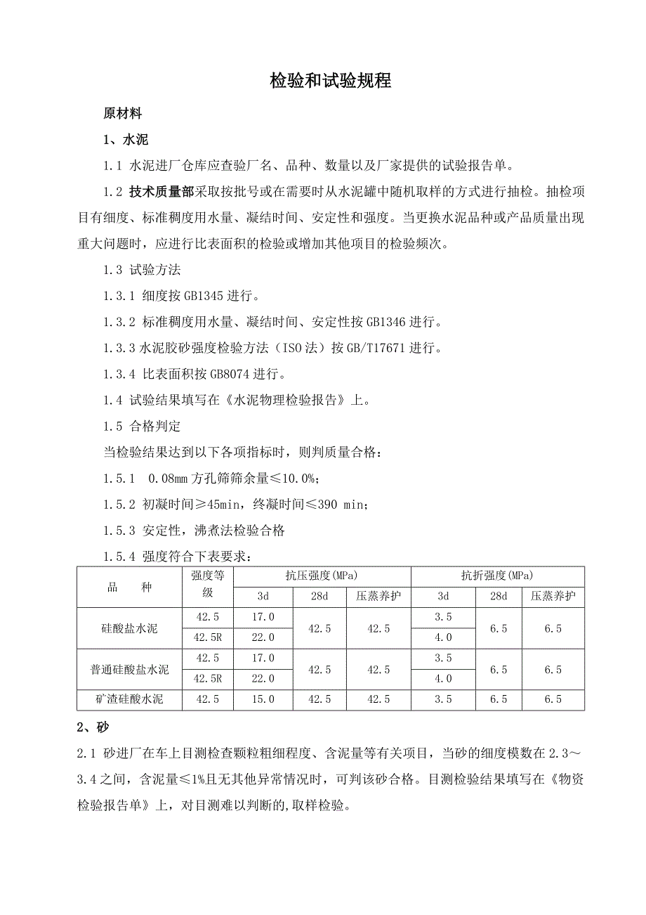检验和试验规程原材料1、水泥 1.1 水泥进厂仓库应查验厂名、品种、数量以及厂家提供的试验报告单 1.2 技术质量部采取按批号或在需要时从水泥罐中随机取样的方式进行抽检抽检项目有细度、标准稠度用水量、凝结时间、安定性和强度当更换水泥品种或产品质量出现重大问题时,应进行比表面积的检验或增加其他项目的检验频次 1.3 试验方法 1.3.1 细度按GB1345进行 1.3.2 标准稠度用水量、凝结时间、安定性按GB1346进行 1.3.3水泥胶砂强度检验方法(ISO法)按GB/T17671进行 1.3.4 比表面积按GB8074进行 1.4 试验结果填写在《水泥物理检验报告》上 1.5 合格判定 当检验结果达到以下各项指标时,则判质量合格: 1.5.1 0.08mm方孔筛筛余量≤10.0%; 1.5.2 初凝时间≥45min,终凝时间≤390 min; 1.5.3 安定性,沸煮法检验合格1.5.4 强度符合下表要求:品 种强度等级抗压强度(MPa)抗折强度(MPa)3d28d压蒸养护3d28d压蒸养护护硅酸盐水泥42.517.042.542.53.56.56.542.5R22.04.0普通硅酸盐水泥42.517.042.542.53.56.56.542.5R22.04.0矿渣硅酸水泥粉煤灰硅酸盐水泥42.515.042.542.53.56.56.52、砂2.1 砂进厂在车上目测检查颗粒粗细程度、含泥量等有关项目,当砂的细度模数在2.3~3.4之间,含泥量≤1%且无其他异常情况时,可判该砂合格。
