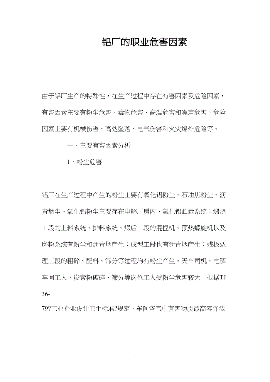 铝厂的职业危害因素 由于铝厂生产的特殊性,在生产过程中存在有害因素及危险因素,有害因素主要有粉尘危害、毒物危害、高温危害和噪声危害,危险因素主要有机械伤害、高处坠落、电气伤害和火灾爆炸危险等 一、主要有害因素分析 1.粉尘危害 铝厂在生产过程中产生的粉尘主要有氧化铝粉尘、石油焦粉尘、沥青烟尘氧化铝粉尘主要存在电解厂房内、氧化铝贮运系统;煅烧工段的上料系统、排料系统、煅后工段的混捏机、预热螺旋机以及磨粉系统有粉尘和沥青烟产生;成型工段也有沥青烟产生;残极处理工段的粗碎、配料、筛分等过程均有粉尘产生天车司机,电解车间工人,炭素粉破碎、筛分等岗位工人受粉尘危害较大根据TJ36-79?工业企业设计卫生标准?规定,车间空气中有害物质最高容许浓度为,生产性粉尘中的氧化铝粉尘不得超过6mg/m3;其他粉尘〔当游离二氧化硅含量在10%以下〕不得超过10mg/m3 2.毒物危害 作业工人接触到的毒物主要有氟化物、硫化物、沥青烟、一氧化碳等毒物主要存在于电解槽附近及烟气净化系统 铝电解以冰晶石-氧化铝氟化铝的熔体为电解质,以炭素材料为电极进行电解电解时在阴极上析出液态的金属铝,在阳极上产生气体。