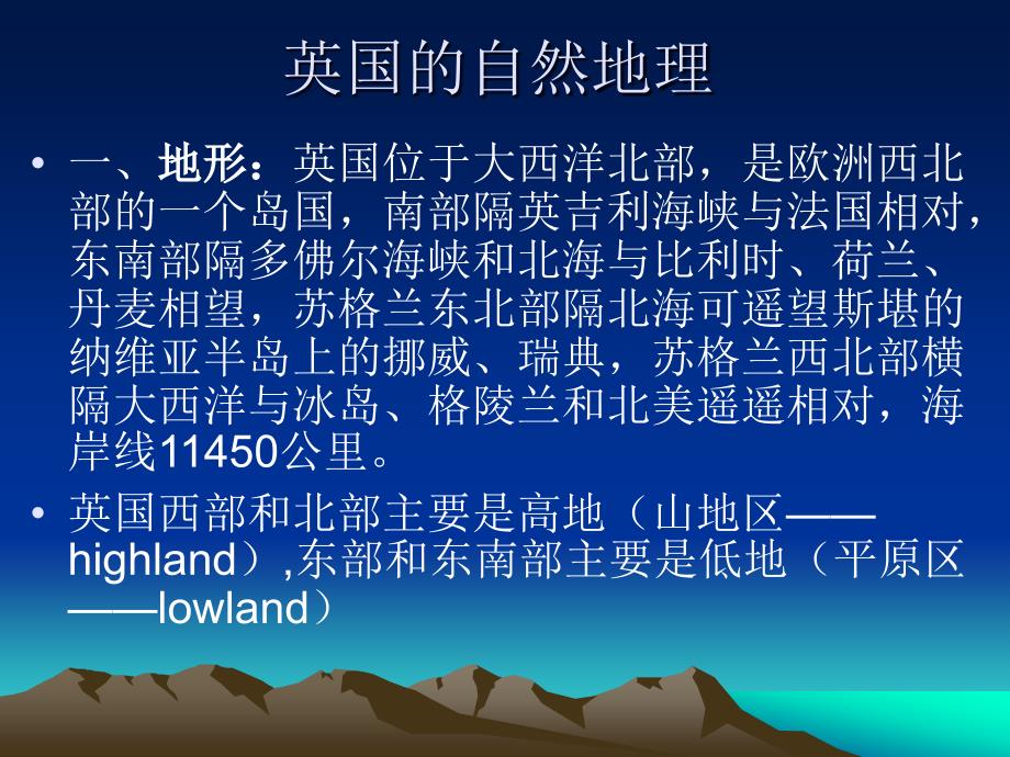 英国的自然地理,一、地形:英国位于大西洋北部,是欧洲西北部的一个岛国,南部隔英吉利海峡与法国相对,东南部隔多佛尔海峡和北海与比利时、荷兰、丹麦相望,苏格兰东北部隔北海可遥望斯堪的纳维亚半岛上的挪威、瑞典,苏格兰西北部横隔大西洋与冰岛、格陵兰和北美遥遥相对,海岸线11450公里 英国西部和北部主要是高地(山地区——highland),东部和东南部主要是低地(平原区——lowland),大不列颠山地区,1. 整个苏格兰:从福思河(River Forth )and 克莱德河(River Clyde) 流域伸展至西北端的Scottish Highlands 及苏格兰南部的丘陵和荒野 2. 英格兰西北部湖区(Lake District) 3. 英格兰中部奔宁山脉(Pennines) 4. 整个威尔士 5. 与英格兰西南部德文(Devon)、康沃尔(Cornwall)两郡相吻合的半岛,英国全境根据地形分为四个区,1. 英格兰东南平原区 2. 中西部山地区 3. 苏格兰山地区 4. 北爱尔兰安特里姆(Antrim) 高原,二、河流、湖泊,(一)河流1. 塞文河(River Severn):英格兰最长的河流,全长354公里,源出威尔士山地,注入大西洋布里斯托尔湾(Bristol ),,2. 泰晤士河(River Thames):英国最主要河流,全长338公里,是伦敦的生命线,它所流经之处,都是英国文化的精华所在。