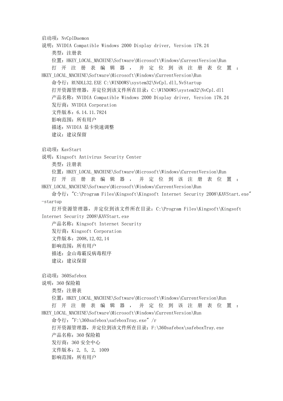 启动项:NvCplDaemon说明:NVIDIA Compatible Windows 2000 Display driver, Version 178.24 类型:注册表 位置:HKEY_LOCAL_MACHINE\Software\Microsoft\Windows\CurrentVersion\Run 打开注册表编辑器,并定位到该注册表位置:HKEY_LOCAL_MACHINE\Software\Microsoft\Windows\CurrentVersion\Run 命令行:RUNDLL32.EXE C:\WINDOWS\system32\NvCpl.dll,NvStartup 打开资源管理器,并定位到该文件所在目录:C:\WINDOWS\system32\NvCpl.dll 产品名称:NVIDIA Compatible Windows 2000 Display driver, Version 178.24 发行商:NVIDIA Corporation 文件版本:6.14.11.7824 影响范围:所有用户 描述:NVIDIA 显卡快速调整 建议:建议保留启动项:KavStart说明:Kingsoft Antivirus Security Center 类型:注册表 位置:HKEY_LOCAL_MACHINE\Software\Microsoft\Windows\CurrentVersion\Run 打开注册表编辑器,并定位到该注册表位置:HKEY_LOCAL_MACHINE\Software\Microsoft\Windows\CurrentVersion\Run 命令行:"C:\Program Files\Kingsoft\Kingsoft Internet Security 2008\KAVStart.exe" -startup 打开资源管理器,并定位到该文件所在目录:C:\Program Files\Kingsoft\Kingsoft Internet Security 2008\KAVStart.exe 产品名称:Kingsoft Internet Security 发行商:Kingsoft Corporation 文件版本:2008,12,02,14 影响范围:所有用户 描述:金山毒霸反病毒程序 建议:建议保留启动项:360Safebox说明:360保险箱 类型:注册表 位置:HKEY_LOCAL_MACHINE\Software\Microsoft\Windows\CurrentVersion\Run 打开注册表编辑器,并定位到该注册表位置:HKEY_LOCAL_MACHINE\Software\Microsoft\Windows\CurrentVersion\Run 命令行:"F:\360safebox\safeboxTray.exe" /r 打开资源管理器,并定位到该文件所在目录:F:\360safebox\safeboxTray.exe 产品名称:360保险箱 发行商:360安全中心 文件版本:2, 5, 2, 1009 影响范围:所有用户 描述:360保险箱 建议:建议保留启动项:360Safetray说明:360安全卫士实时保护模块 类型:注册表 位置:HKEY_LOCAL_MACHINE\Software\Microsoft\Windows\CurrentVersion\Run 打开注册表编辑器,并定位到该注册表位置:HKEY_LOCAL_MACHINE\Software\Microsoft\Windows\CurrentVersion\Run 命令行:"F:\360safe\safemon\360tray.exe" /start 打开资源管理器,并定位到该文件所在目录:F:\360safe\safemon\360tray.exe 产品名称:未知 发行商:360安全中心 文件版本:5, 2, 0, 1015 影响范围:所有用户 描述:360安全卫士实时保护模块 建议:可以保留启动项:ctfmon.exe说明:提供语音识别、手写识别、键盘、翻译和其他用户输入技术的支持 类型:注册表 位置:HKEY_CURRENT_USER\Software\Microsoft\Windows\CurrentVersion\Run 打开注册表编辑器,并定位到该注册表位置:HKEY_CURRENT_USER\Software\Microsoft\Windows\CurrentVersion\Run 命令行:C:\WINDOWS\system32\ctfmon.exe 打开资源管理器,并定位到该文件所在目录:C:\WINDOWS\system32\ctfmon.exe 产品名称:Microsoft? Windows? Operating System 发行商:Microsoft Corporation 文件版本:5.1.2600.5512 (xpsp.080413-2105) 影响范围:当前用户 描述:提供语音识别、手写识别、键盘、翻译和其他用户输入技术的支持 建议:建议保留启动项:KavPFW说明:Kingsoft Internet Security 类型:注册表 位置:HKEY_CURRENT_USER\Software\Microsoft\Windows\CurrentVersion\Run 打开注册表编辑器,并定位到该注册表位置:HKEY_CURRENT_USER\Software\Microsoft\Windows\CurrentVersion\Run 命令行:"C:\Program Files\Kingsoft\Kingsoft Internet Security 2008\KPFW32.EXE" -startup 打开资源管理器,并定位到该文件所在目录:C:\Program Files\Kingsoft\Kingsoft Internet Security 2008\KPFW32.EXE 产品名称:Kingsoft Internet Security 发行商:Kingsoft Corporation 文件版本:2008,11,07,674 影响范围:当前用户 描述:Kingsoft Internet Security 建议:无启动项:PPLiveVA说明:PPVA application 类型:注册表 位置:HKEY_CURRENT_USER\Software\Microsoft\Windows\CurrentVersion\Run 打开注册表编辑器,并定位到该注册表位置:HKEY_CURRENT_USER\Software\Microsoft\Windows\CurrentVersion\Run 命令行:C:\Program Files\PPLiveVA\PPLiveVA.exe /LoadModule PPVA.DLL /M REAL /S 0 /T 0 打开资源管理器,并定位到该文件所在目录:C:\Program Files\PPLiveVA\PPLiveVA.exe 产品名称:PPVA application 发行商:Synacast 文件版本:0, 1, 0, 9 影响范围:当前用户 描述:PPVA application 建议:无启动项:QvodPlayer说明:QvodTerminal 类型:注册表 位置:HKEY_CURRENT_USER\Software\Microsoft\Windows\CurrentVersion\Run 打开注册表编辑器,并定位到该注册表位置:HKEY_CURRENT_USER\Software\Microsoft\Windows\CurrentVersion\Run 命令行:D:\kuaibo\QvodPlayer\QvodTerminal.exe 打开资源管理器,并定位到该文件所在目录:D:\kuaibo\QvodPlayer\QvodTerminal.exe 产品名称:QvodTerminal 发行商:Shenzhen QVOD Technology Co.,Ltd 文件版本:3, 5, 0, 61 影响范围:当前用户 描述:QvodTerminal 建议:无启动项:PPAP说明:PP加速器网络加速特性支持模块 类型:注册表 位置:HKEY_CURRENT_USER\Software\Microsoft\Windows\CurrentVersion\Run 打开注册表编辑器,并定位到该注册表位置:HKEY_CURRENT_USER\Software\Microsoft\Windows\CurrentVersion\Run 命令行:C:\Documents and Settings\All Users\Application Data\PPLiveVA\Application\PPAP.exe 打开资源管理器,并定位到该文件所在目录:C:\Documents and Settings\All Users\Application Data\PPLiveVA\Application\PPAP.exe 产品名称:Synacast PPAP 发行商:Synacast 文件版本:1, 0, 0, 10 影响范围:当前用户 描述:PP加速器网络加速特性支持模块 建议:无启动项:PPLive说明:PPLive 类型:注册表 位置:HKEY_CURRENT_USER\Software\Microsoft\Windows\CurrentVersion\Run 打开注册表编辑器,并定位到该注册表位置:HKEY_CURRENT_USER\Software\Microsoft\Windows\CurrentVersion\Run 命令行:"D:\新建文件夹\PPLive\PPLive.exe" /LoadModule ppvod.dll 打开资源管理器,并定位到该文件所在目录:D:\新建文件夹\PPLive\PPLive.exe 产品名称:PPLive 发行商:未知 文件版本:2, 0,