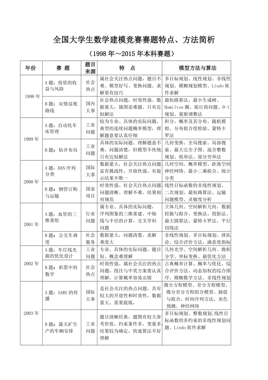 全国大学生数学建模竞赛赛题特点、方法简析(1998年~2015年本科赛题)年份赛 题题目来源特 点模型方法与算法1998年A题:投资的收益与风险社会热点属社会关注热点问题,题目不难、模型好写、变换问题、求解要有技巧多目标规划、线性规划、非线性规划、模糊规划模型、Lindo软件求解B题:灾情巡视路线国内大事社会热点问题,时效性强、数据量大,属图论难题、只有近似解法最短路算法,最小生成树、Hamilton圈、旅行商问题、0-1规划、观察调整法1999年A题:自动化车床管理工业问题较为专业、具体的实际问题,典型的连续问题概率模型,理解题意要认真仔细积分、概率及其分布、随机模拟、分布拟合度检验、蒙特卡罗法B题:钻井布局工业问题具体的实际问题、理解题意不难,问题清楚,但模型不传统,只有近似解法几何变换、全局搜索、局部搜索、最大完全子图、混合整数规划、枚举法、部分穷举法2000年A题:DAN序列分类国际大事数据量大,社会关注热点问题、富有挑战性、开放性强、有提示结果不惟一几何空间、概率模型、距离空间、神经网络、最小二乘拟合、统计分类B题:钢管订购与运输国家项目时效性强、社会关注热点问题,问题清晰、理解不难、结果相对规范线性目标函数的非线性规划、二次规划、最短路算法、运输问题模型、灵敏度分析2001年A题:血管的三维重组行业问题属专业、具体的实际问题,序列图象的三维重建、中轴线与半径的计算,交叉学科问题立体几何、空间解析几何,数据挖掘与拟合、变换法、投影法、最大圆算法、蒙特卡罗法、平行切线法B题:公交车调度社会服务数据量大,问题清楚,求解难度大非线性规划、多目标规划、排队论、综合评价方法,满意度指标2002年A题:车灯线光源的优化设计工业问题专业、具体的实际问题,题目短、概念难理解几何光学、空间解析几何、微积分学、坐标变换、最优化方法B题:彩票中的数学社会热点时效性强、属社会关注的热点问题,投注与中奖方案要认真理解,计算概率容易出错古典概率计算、概率与优化、综合评价方法、动态加权的综合排序、模糊数学方法、非线性规划2003年A题:SARS的传播国际大事是社会关注的热点问题,具有较大的开放性和时效性,数据量大、需要提炼,微分方程模型、差分方程模型、微分差分方程组合模型、插值与拟合,时间序列方法,灰色预测、神经网络B题:露天矿生产的车辆安排工业问题题目清晰经典,题图有较大参考价值,约束条件多、变量多,结果较为确定,快速算法不好理解多目标规划、整数规划,线性目标函数的多约束的非线性规划问题、Lindo软件求解2004年A题:奥运会临时超市网点设计国内大事属社会关注热点问题,具有较强的时效性和挑战性、开放性强、通用性好整数线性规划、回归方法、电路模拟方法、图论算法、统计方法、数据挖掘B题:电力市场的输电阻塞管理工业问题较为专业、具体的实际问题,题目长、概念多、理解难度大,科研推动大回归方法、非线性规划、线性规划、理想点法、加权法、最大最小法、数值模拟、分段函数与积分表示2005年A题:长江水质的评价和预测社会热点数据量大,数据需要提炼, 有些无用数据,求解方法较多、挑战性强综合评价方法、回归分析、动态加权的综合排序,插值与拟合、时间序列方法、灰色预测、微分方程、差分方程B题:DVD租赁行业问题数据量大,所提问题多,题意理解有一定难度满意度函数,概率模型、线性规划、混合整数规划、抽样分析、网络流,数值模拟2006年A题:出版社的资源配置行业问题海量数据,数据不完备,信息结构复杂、挑战性强,离散问题,模型明确数据处理、满意度等指标函数,多目标规划、非线性规划,网络流优化模型B题:艾滋病疗法的评价及疗效的预测国际关注数据量大,挑战性强,社会影响力大,数据回归处理难度大综合评价方法,插值与拟合,各种回归模型,时间序列方法,灰色预测,微分方程模型2007年A题:中国人口增长预测社会热点附件内容多、开放性较强,大问题传统、社会关注数据分析与处理,回归模型、微分方程模型、差分方程模型B题:乘公交,看奥运国内大事社会关注热点,数据量大、复杂、挑战性强多目标规划,最短路算法、搜索算法,距离矩阵、分步优化处理2008年A题:数码相机定位行业问题问题具体、专业性强、要有光学知识,采取模拟方法理解所提问题几何光学、解析几何模型、坐标系变换、求圆心像方法(公切线方法)、线性投射模型B题:高等教育学费标准探讨社会热点开放性强、社会关注性强,突出数据来源的可靠性、结论解释的合理性数据收集与处理、问题的分析与假设,初等数学方法、一般统计方法、多目标规划、回归分析、综合评价方法、灰色预测2009年A题:制动器试验台的控制方法分析工业问题问题具体、专业性强,要花时间读懂、理解清楚问题物理中能量等力学公式,初等数学模型、微积分学B题:眼科病床的合理安排社会服务数据量大,问题清楚,实践性强排队论、数值模拟、概率分布、随机规划、仿真计算、仿真优化2010年A题:储油罐的变位识别与罐容表标定工业问题较为专业、具体的实际问题,规范性强,要花时间读懂、理解清楚问题空间解析几何、微积分学、最小二乘法,数值积分法B题:2010年上海世博会影响力的定量评估国际关注题目开放性、时效性强、社会关注,问