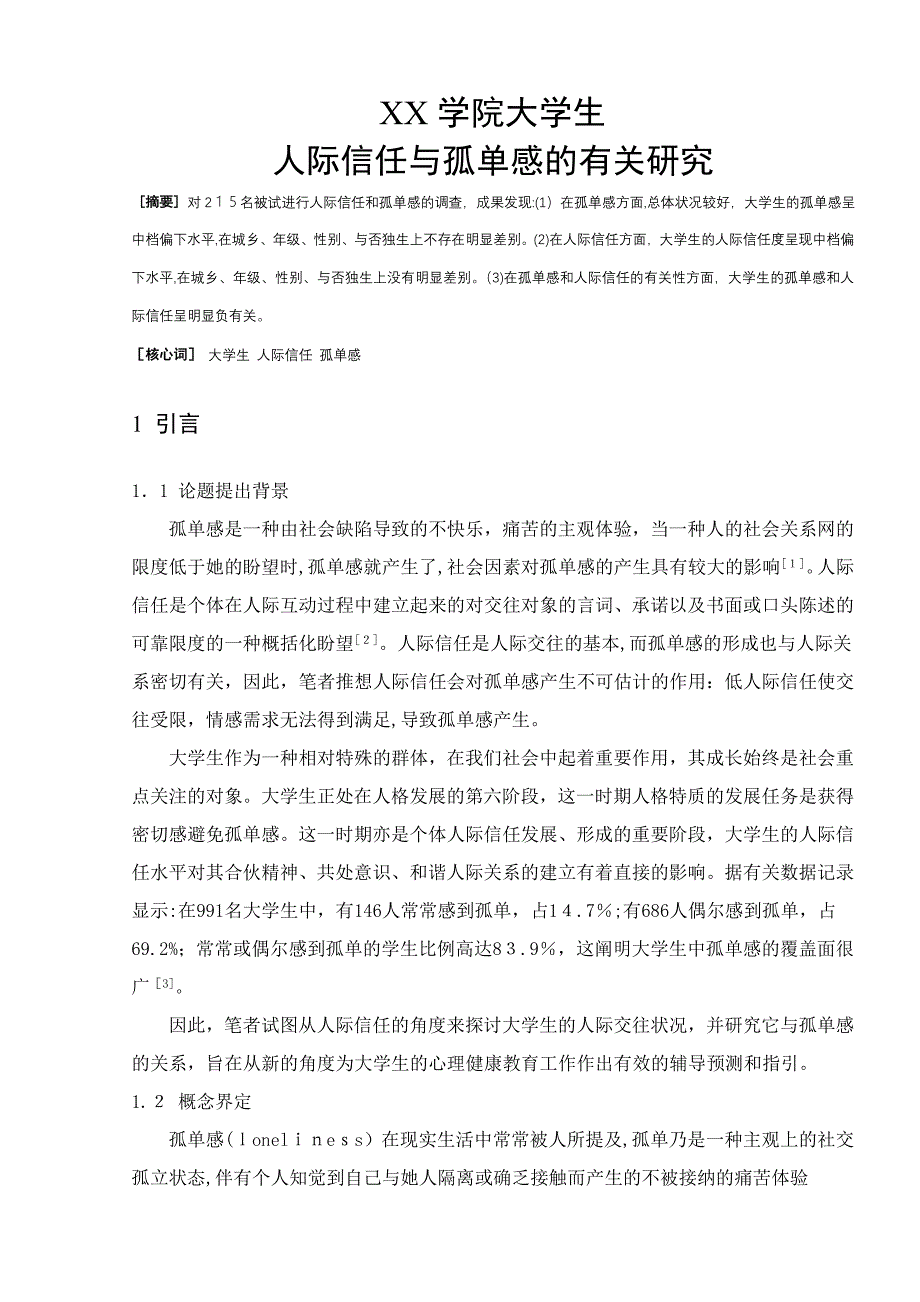 随着市场经济体制的逐渐完善,个人信用体系也逐渐建立,这对国内的教育特别是基本教育的人际信任问题也提出了更新、更高、更全面的规定,特别是对大学生,其人际信任水平对和谐人际关系的建立产生了直接的影响林丽、张建新《人际信任及其在组织管理中的应用》对人际信任从管理学角度进行了明确的定义,并且研究了影响人际信任的因素郑信军《青少年的人际信任的调查研究》对青少年的人际信任问题做过调查,发现大学生的人际信任度偏低,高中生最高,在性别上没有差别[15]郭志峰《大学生心理控制源于人际信任研究》发现,大学生的人际信任、孤单感不存在城乡差别[16]社会因素对孤单感的产生具有较大影响,本文试图从人际信任的角度来探讨大学生的人际关系状况,并考察它与孤单感的关系,以期对素质教育的进一步展开有所发展但从人际信任的角度考察导致其产生孤单感因素或者两者有关性的研究也还比较欠缺2 研究措施2.1 被试选用XX学院学生进行测试,发放问卷260份,回收248份,剔除无效问卷最后有效问卷为215份,有效问卷占总数的82.69%其中男生93人,女生122人;大一42人,大二70人,大三48人,大四55人;114人来自都市,101人来自农村;135人为独生子女,80人为非独生子女。