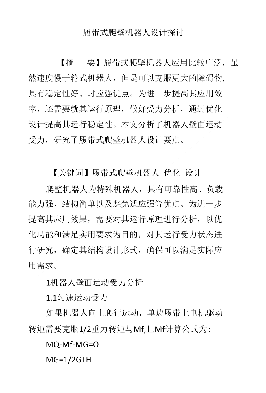 履带式爬壁机器人设计探讨【摘 要】履带式爬壁机器人应用比较广泛,虽 然速度慢于轮式机器人,但是可以克服更大的障碍物, 具有稳定性好、时应强优点为进一步提高其应用效 率,还需要就其运行原理,做好受力分析,通过优化 设计提高其运行稳定性本文分析了机器人壁面运动 受力,研究了履带式爬壁机器人设计要点关键词】履带式爬壁机器人 优化 设计爬壁机器人为特殊机器人,具有可靠性高、负载能力强、结构简单以及避免适应强等优点为进一步 提高其应用效果,需要对其运行原理进行分析,以优 化功能和满足实用要求为目的,对其运行受力状态进 行研究,确定其结构设计形式,确保可以满足实际应 用需求1机器人壁面运动受力分析1.1匀速运动受力如果机器人向上爬行运动,单边履带上电机驱动转矩需要克服1/2重力转矩与Mf,且Mf计算公式为:MQ-Mf-MG=OMG=1/2GTH其中,MQ表示单侧电机减速后输出驱动转矩; Mf表示机器人履带上最下面一块电磁铁受力所产生 的阻力矩;MG表示1/2重力产生的转矩;F1表示履 带最下面一块磁铁对壁面的压力,且Fl=Fn-Nlo则: Mf=Flh= (Fn-Nl) h,由此可得单侧电机所需驱动转 矩:MQN (Fn-Nl) h+ (HGcos a ) /21.2转弯运动受力如果机器人沿壁面转弯运动,对其运动模型进行 分析,需要通过两台履带差速来玩完成转弯动作,而 在实际设计中,基本上都选择通过正、反转两条履带 方式来完成转弯。