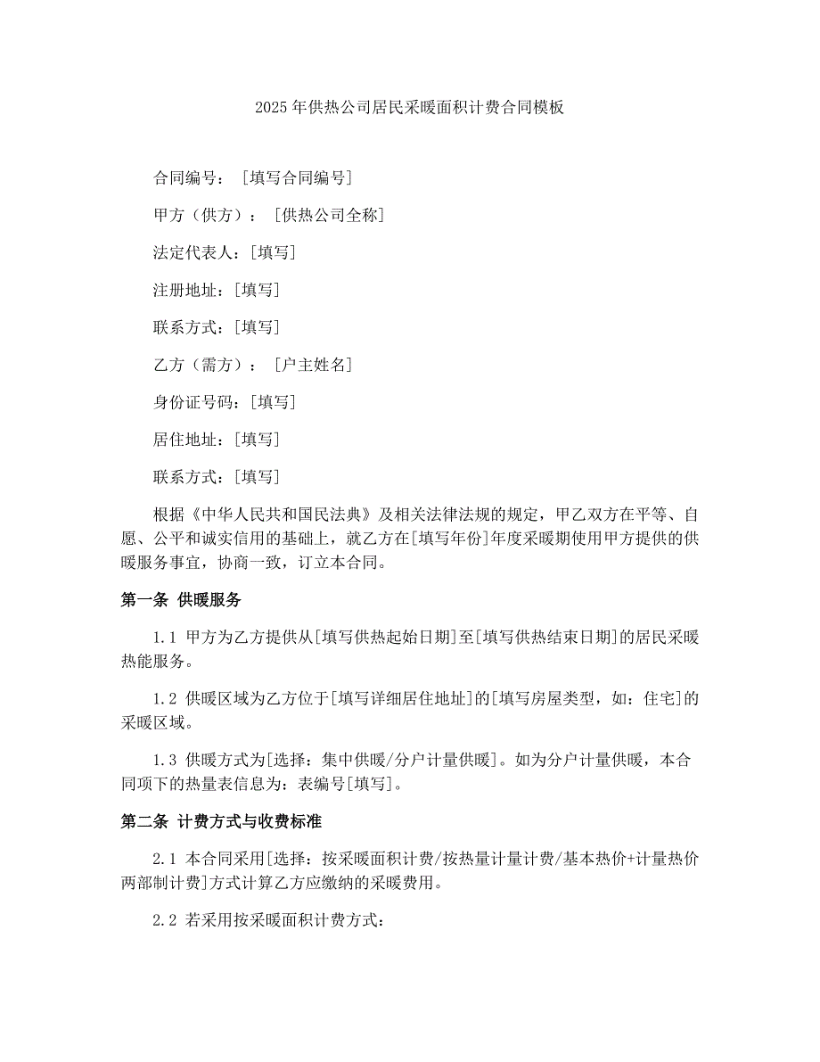 2025年供热公司居民采暖面积计费合同模板合同编号: [填写合同编号]甲方(供方): [供热公司全称]法定代表人:[填写]注册地址:[填写]联系方式:[填写]乙方(需方): [户主姓名]身份证号码:[填写]居住地址:[填写]联系方式:[填写]根据《中华人民共和国民法典》及相关法律法规的规定,甲乙双方在平等、自愿、公平和诚实信用的基础上,就乙方在[填写年份]年度采暖期使用甲方提供的供暖服务事宜,协商一致,订立本合同第一条 供暖服务1.1 甲方为乙方提供从[填写供热起始日期]至[填写供热结束日期]的居民采暖热能服务1.2 供暖区域为乙方位于[填写详细居住地址]的[填写房屋类型,如:住宅]的采暖区域1.3 供暖方式为[选择:集中供暖/分户计量供暖]如为分户计量供暖,本合同项下的热量表信息为:表编号[填写]第二条 计费方式与收费标准2.1 本合同采用[选择:按采暖面积计费/按热量计量计费/基本热价+计量热价两部制计费]方式计算乙方应缴纳的采暖费用2.2 若采用按采暖面积计费方式: 2.2.1 乙方的采暖面积为[填写采暖面积]平方米该面积依据[选择:房产证/购房合同/双方现场确认测量结果]确定。