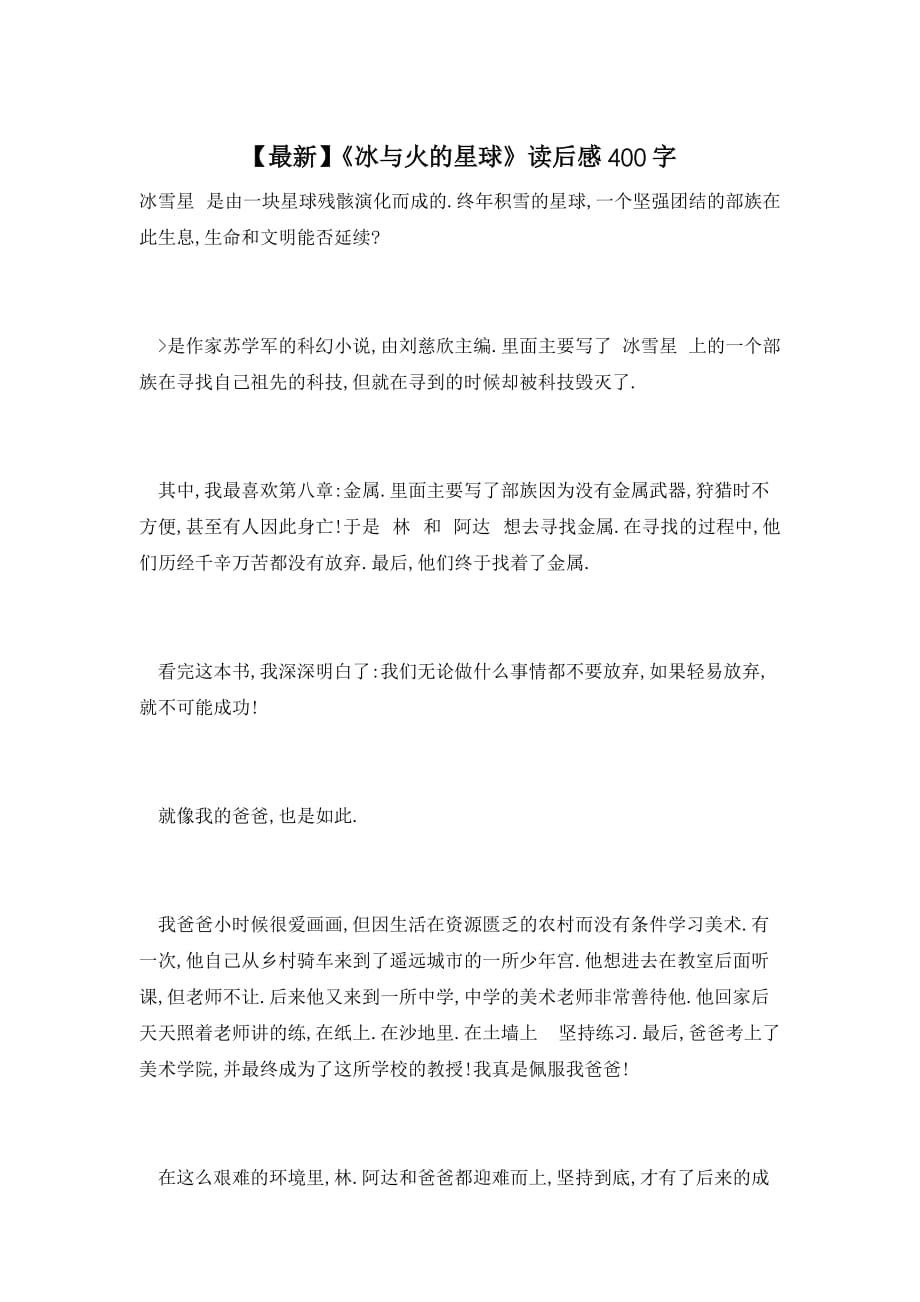最新】《冰与火的星球》读后感400字冰雪星 是由一块星球残骸演化而成的.终年积雪的星球,一个坚强团结的部族在此生息,生命和文明能否延续? >是作家苏学军的科幻小说,由刘慈欣主编.里面主要写了 冰雪星 上的一个部族在寻找自己祖先的科技,但就在寻到的时候却被科技毁灭了. 其中,我最喜欢第八章:金属.里面主要写了部族因为没有金属武器,狩猎时不方便,甚至有人因此身亡!于是 林 和 阿达 想去寻找金属.在寻找的过程中,他们历经千辛万苦都没有放弃.最后,他们终于找着了金属. 看完这本书,我深深明白了:我们无论做什么事情都不要放弃,如果轻易放弃,就不可能成功! 就像我的爸爸,也是如此. 我爸爸小时候很爱画画,但因生活在资源匮乏的农村而没有条件学习美术.有一次,他自己从乡村骑车来到了遥远城市的一所少年宫.他想进去在教室后面听课,但老师不让.后来他又来到一所中学,中学的美术老师非常善待他.他回家后天天照着老师讲的练,在纸上.在沙地里.在土墙上 坚持练习.最后,爸爸考上了美术学院,并最终成为了这所学校的教授!我真是佩服我爸爸! 在这么艰难的环境里,林.阿达和爸爸都迎难而上,坚持到底,才有了后来的成功!所以,生活中.学习中我们不能遇到一点困难.挫折就轻易地放弃,否则,成功便永远与我们无缘! 。