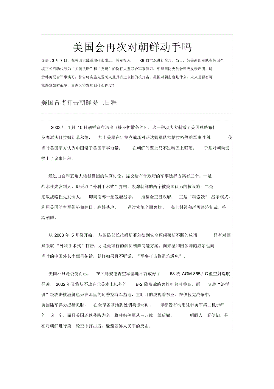 美国会再次对朝鲜动手吗导语 : 3 月 7 日,在韩国京畿道坡州市附近,韩军投入K9 自主炮进行演习当日,韩美两国军队在韩国全境正式启动代号为“关键决断”和“秃鹫”的例行大型联合军事演习朝鲜国防委员会当天发表声明,谴责韩美联合军事演习,警告将实施先发制人且具有进攻性的核打击美国对朝态度是什么,未来是否有可能爆发朝鲜战争,事态又将发展到什么程度?美国曾将打击朝鲜提上日程2003 年 1 月 10 日朝鲜宣布退出《核不扩散条约》,这一举动大大刺激了美国总统布什及鹰派头目拉姆斯菲尔德,加上美军在伊拉克战场对萨达姆军队摧枯拉朽般的军事胜利,使当时美国军方认为中国慑于美国军事力量,在朝鲜问题上只不过嘴巴上强硬,于是对朝动武提上了议事日程经过白宫和五角大楼智囊团的认真讨论,提交给布什政府的军事选择方案有三个一是战术性先发制人,即采取“外科手术式”打击,轰炸朝鲜的两个被美国认为的核设施;二是采取战略性先发制人,即同南韩一起发起战争,推翻金正日政府;三是“科索沃” 战争模式,利用美国的空军优势和驻日、驻韩基地,通过实施全面轰炸、海上封锁和严厉经济制裁,拖跨朝鲜从 2003 年 5 月份开始, 从国防部长拉姆斯菲尔德到安全顾问莱斯不断的放话,只有对朝鲜采取 “外科手术式”打击,才是最可行的解决朝鲜问题方案。