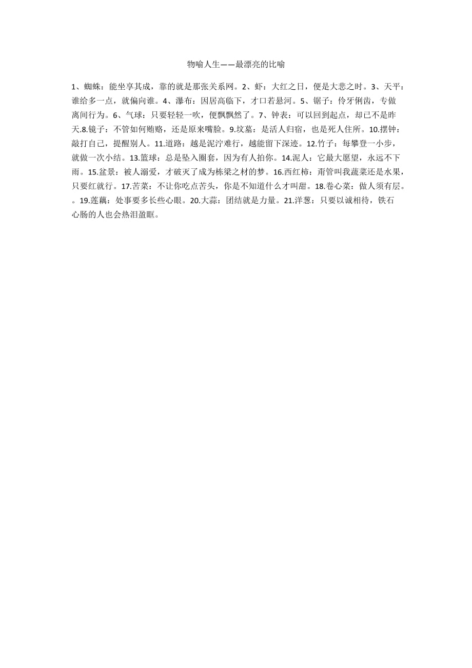 物喻人生——最漂亮的比喻1、蜘蛛:能坐享其成,靠的就是那张关系网2、虾:大红之日,便是大悲之时3、天平:谁给多一点,就偏向谁4、瀑布:因居高临下,才口若悬河5、锯子:伶牙俐齿,专做离间行为6、气球:只要轻轻一吹,便飘飘然了7、钟表:可以回到起点,却已不是昨天.8.镜子:不管如何贿赂,还是原来嘴脸9.坟墓:是活人归宿,也是死人住所10.摆钟:敲打自己,提醒别人11.道路:越是泥泞难行,越能留下深迹12.竹子:每攀登一小步,就做一次小结13.篮球:总是坠入圈套,因为有人拍你14.泥人:它最大愿望,永远不下雨15.盆景:被人溺爱,才破灭了成为栋梁之材的梦16.西红柿:甭管叫我蔬菜还是水果,只要红就行17.苦菜:不让你吃点苦头,你是不知道什么才叫甜18.卷心菜:做人须有层19.莲藕:处事要多长些心眼20.大蒜:团结就是力量21.洋葱:只要以诚相待,铁石心肠的人也会热泪盈眶。