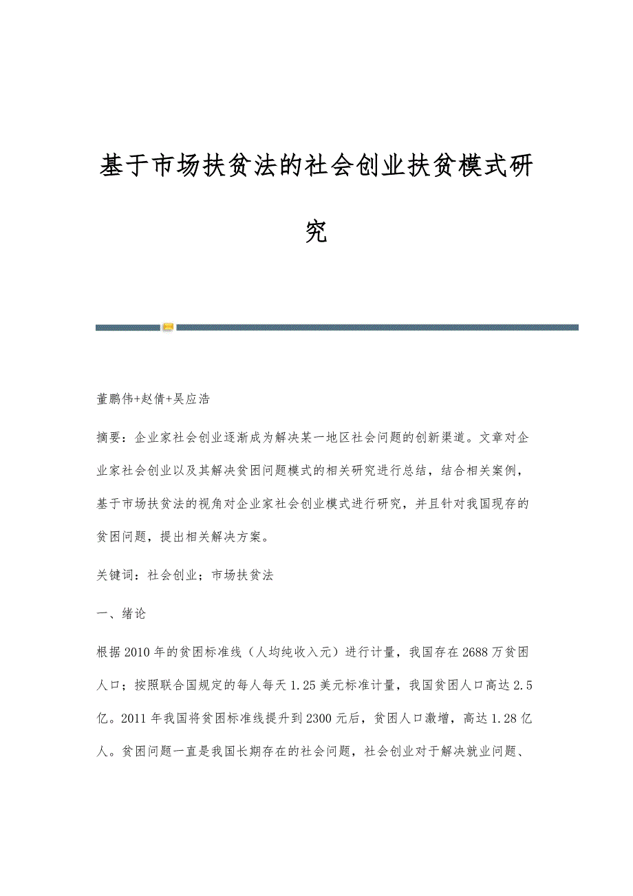 基于市场扶贫法的社会创业扶贫模式研究 董鹏伟+赵倩+吴应浩摘要:企业家社会创业逐渐成为解决某一地区社会问题的创新渠道文章对企业家社会创业以及其解决贫困问题模式的相关研究进行总结,结合相关案例,基于市场扶贫法的视角对企业家社会创业模式进行研究,并且针对我国现存的贫困问题,提出相关解决方案关键词:社会创业;市场扶贫法一、绪论根据2010年的贫困标准线(人均纯收入元)进行计量,我国存在2688万贫困人口;按照联合国规定的每人每天1.25美元标准计量,我国贫困人口高达2.5亿2011年我国将贫困标准线提升到2300元后,贫困人口激增,高达1.28亿人贫困问题一直是我国长期存在的社会问题,社会创业对于解决就业问题、缓解贫困以及稳定社会等方面有重要影响企业家社会创业作为一种解决社会问题的新方案,受到许多国家与社会组织的青睐市场扶贫法是近年来企业家通过社会创业解决贫困问题的主要方法之一市场扶贫法,是指公司试图通过开发或销售的产品及服务,解决低收入人群贫困的社会问题西方已有学者基于社会创业和市场扶贫法进行研究,但未提出相关的扶贫模型,因此,本文基于之前已有研究,针对我国贫困问题提出相关解决方案二、社会创业研究现状(一)社会创业概念研究有关社会创业的研究最早兴起于20世纪后期,北美等发达地区的学者开始提出“社会创业”(social entrepreneurship)这一概念。