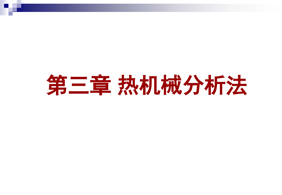 以3个试样的平均值表示实验结果n图中显示的是金属铁的线膨胀曲线和物理膨胀系数曲线实验在氦气气氛下进行,使用 5K/min 的升温速率在 906℃(物理 Alpha 曲线的峰值温度)处出现收缩现象,这表明此时金属铁发生晶格转变(bcc→fcc),另一个晶格转变出现在1409℃(fcc→bcc)这两个数值与文献值有所偏差是由于样品中存在少量杂质 3.1.8 典型应用举例n3.2 静态热机械分析法静态热机械分析法(TMA)n3.2.1 TMA法的定义及用途热机械分析技术是在程序温度控制下(等速升温、降温、恒温或循环温度),测量物质在受非振荡性的负荷(如恒定负荷)时所产生的形变随温度变化的一种技术,简称TMA由于各种物质随温度的变化,其力学性能相应地发生变化因此,热机械分析对研究和测量材料的应用温度范围、加工条件、力学性能等都具有十分重要的意义热机械分析虽然涉及的材料对象非常广泛,包括金属、陶瓷、无机、有机等材料,但用它来研究高分子材料的玻璃化温度Tg、流动温度Tf、相转变点、杨氏模量、应力松弛等更具有特殊的意义nTMA可以用来测量与研究材料的如下特性:n线膨胀与收缩性能 n玻璃化温度 n穿刺性能 n薄膜、纤维的拉伸收缩 n热塑性材料的热性能分析n相转变 n软化温度 n分子重结晶效应 n应力与应变的函数关系 n热固性材料的固化性能3.2.2 热机械分析仪的种类n热机械分析仪按机械结构形式不同可以分为天平式和直筒式两种3.2.2.1 天平式探头和外套管等可用石英、氧化铝瓷或钨等材料制成。