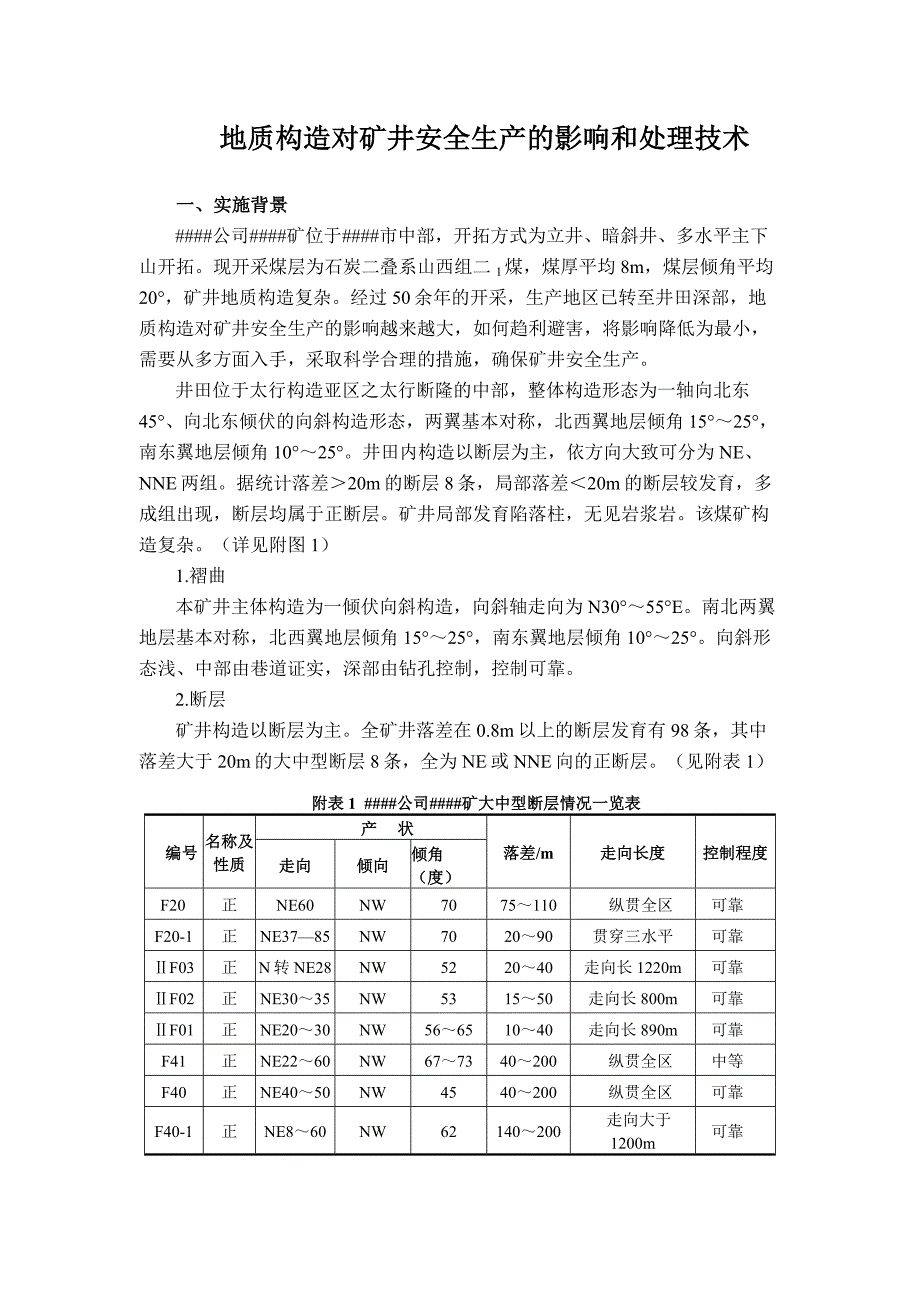 地质构造对矿井安全生产的影响和处理技术一、实施背景####公司####矿位于####市中部,开拓方式为立井、暗斜井、多水平主下山开拓现开采煤层为石炭二叠系山西组二1煤,煤厚平均8m,煤层倾角平均20°,矿井地质构造复杂经过50余年的开采,生产地区已转至井田深部,地质构造对矿井安全生产的影响越来越大,如何趋利避害,将影响降低为最小,需要从多方面入手,采取科学合理的措施,确保矿井安全生产井田位于太行构造亚区之太行断隆的中部,整体构造形态为一轴向北东45°、向北东倾伏的向斜构造形态,两翼基本对称,北西翼地层倾角15°~25°,南东翼地层倾角10°~25°井田内构造以断层为主,依方向大致可分为NE、NNE两组据统计落差>20m的断层8条,局部落差<20m的断层较发育,多成组出现,断层均属于正断层矿井局部发育陷落柱,无见岩浆岩该煤矿构造复杂详见附图1)1.褶曲本矿井主体构造为一倾伏向斜构造,向斜轴走向为N30°~55°E南北两翼地层基本对称,北西翼地层倾角15°~25°,南东翼地层倾角10°~25°向斜形态浅、中部由巷道证实,深部由钻孔控制,控制可靠2.断层矿井构造以断层为主全矿井落差在0.8m以上的断层发育有98条,其中落差大于20m的大中型断层8条,全为NE或NNE向的正断层。