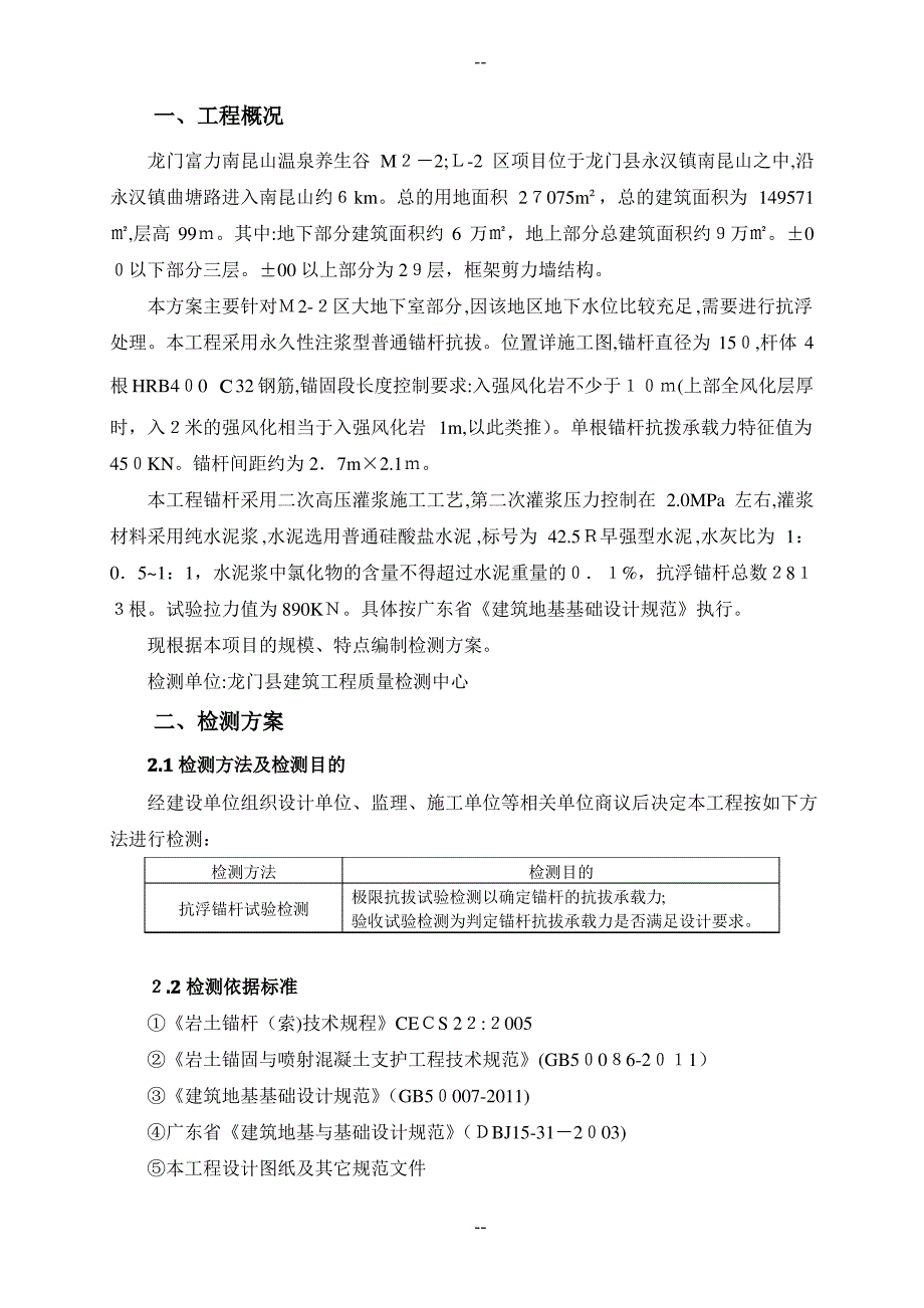 现根据本项目的规模、特点编制检测方案检测单位:龙门县建筑工程质量检测中心二、检测方案二、检测方案2.12.1 检测方法及检测目的检测方法及检测目的经建设单位组织设计单位、监理、施工单位等相关单位商议后决定本工程按如下方法进行检测:检测方法抗浮锚杆试验检测检测目的极限抗拔试验检测以确定锚杆的抗拔承载力;验收试验检测为判定锚杆抗拔承载力是否满足设计要求22.2.2 检测依据标准检测依据标准①《岩土锚杆(索)技术规程》CECS 22:2005②《岩土锚固与喷射混凝土支护工程技术规范》(GB50086-2011)③《建筑地基基础设计规范》 (GB50007-2011)④广东省《建筑地基与基础设计规范》 (DBJ15-31-2003)⑤本工程设计图纸及其它规范文件----2.32.3 抽检数量抽检数量 抗浮锚杆检测:抗浮锚杆检测:2.3.1 依据规范进行检测:①根据设计图纸及 《建筑地基基础设计规范》 (GB50007-2011)附录 M 岩石锚杆抗拔试验要点第 M.0.1 条的要求锚杆施工前,用3 根试验锚杆进行极限抗拔试验以确定锚杆的抗拔承载力②根据设计图纸要求锚杆施工完成后应进行验收试验 ,试验数量不少于锚杆总数的5%,最大试验荷载取锚杆轴向拉力值的 1.5 倍。