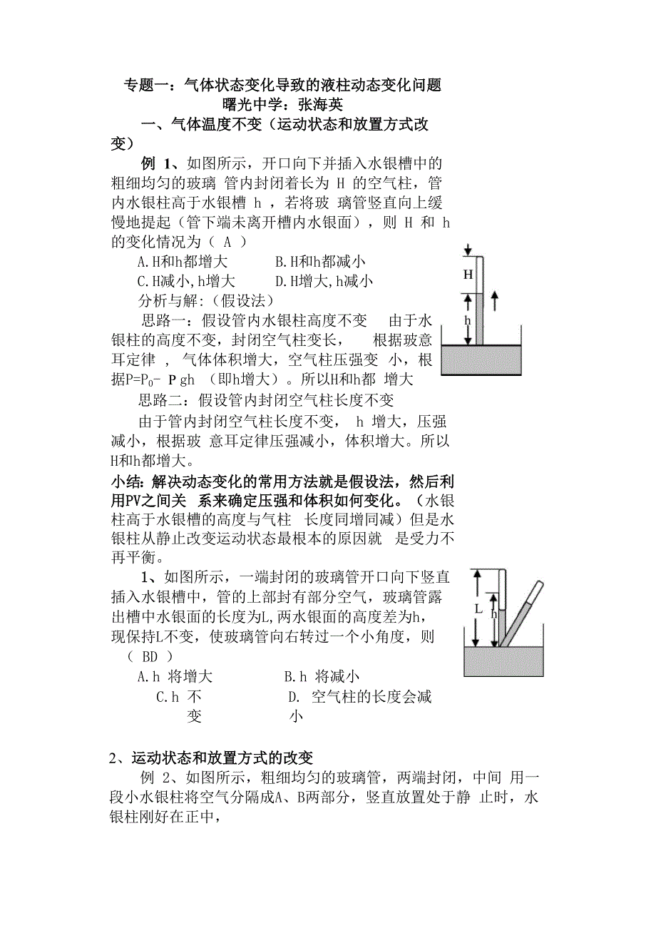 专题一:气体状态变化导致的液柱动态变化问题曙光中学:张海英一、气体温度不变(运动状态和放置方式改变)例 1、如图所示,开口向下并插入水银槽中的粗细均匀的玻璃 管内封闭着长为 H 的空气柱,管内水银柱高于水银槽 h ,若将玻 璃管竖直向上缓慢地提起(管下端未离开槽内水银面),则 H 和 h的变化情况为( A )A.H和h都增大 B.H和h都减小C.H减小,h增大 D.H增大,h减小分析与解:(假设法)思路一:假设管内水银柱高度不变 由于水银柱的高度不变,封闭空气柱变长, 根据玻意耳定律 , 气体体积增大,空气柱压强变 小,根据P=P0- P gh (即h增大)所以H和h都 增大思路二:假设管内封闭空气柱长度不变由于管内封闭空气柱长度不变, h 增大,压强减小,根据玻 意耳定律压强减小,体积增大所以H和h都增大小结:解决动态变化的常用方法就是假设法,然后利用PV之间关 系来确定压强和体积如何变化水银柱高于水银槽的高度与气柱 长度同增同减)但是水银柱从静止改变运动状态最根本的原因就 是受力不再平衡1、如图所示,一端封闭的玻璃管开口向下竖直 插入水银槽中,管的上部封有部分空气,玻璃管露 出槽中水银面的长度为L,两水银面的高度差为h, 现保持L不变,使玻璃管向右转过一个小角度,则( BD )A.h 将增大 B.h 将减小C.h 不变D. 空气柱的长度会减小2、运动状态和放置方式的改变例 2、如图所示,粗细均匀的玻璃管,两端封闭,中间 用一段小水银柱将空气分隔成A、B两部分,竖直放置处于静 止时,水银柱刚好在正中,(1)现让玻璃管做自由落体运动时,水银柱相对玻璃管 如何移动?原来静止时 P>P ,玻璃管自由落体运动时,水银处于完全失 重状态,所以末状态当水银柱相对玻璃管稳定时 P=P (结合受力 分析),对于A气体压强增大根据玻意耳定律,体积减小,而B气 体正好相反,所以水银相对玻璃管向上移动。