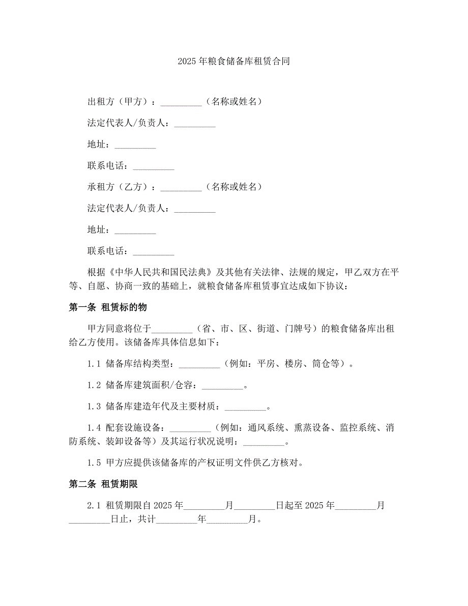 2025年粮食储备库租赁合同出租方(甲方):_________(名称或姓名)法定代表人/负责人:_________地址:_________联系:_________承租方(乙方):_________(名称或姓名)法定代表人/负责人:_________地址:_________联系:_________根据《中华人民共和国民法典》及其他有关法律、法规的规定,甲乙双方在平等、自愿、协商一致的基础上,就粮食储备库租赁事宜达成如下协议:第一条 租赁标的物甲方同意将位于_________(省、市、区、街道、门牌号)的粮食储备库出租给乙方使用该储备库具体信息如下:1.1 储备库结构类型:_________(例如:平房、楼房、筒仓等)1.2 储备库建筑面积/仓容:_________1.3 储备库建造年代及主要材质:_________1.4 配套设施设备:_________(例如:通风系统、熏蒸设备、监控系统、消防系统、装卸设备等)及其运行状况说明:_________1.5 甲方应提供该储备库的产权证明文件供乙方核对第二条 租赁期限2.1 租赁期限自2025年_________月_________日起至2025年_________月_________日止,共计_________年_________月。