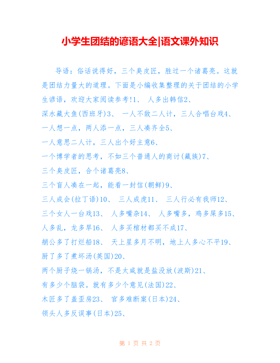 小学生团结的谚语大全|语文课外知识导语:俗话说得好,三个臭皮匠,胜过一个诸葛亮这就是团结力量大的道理下面是小编收集整理的关于团结的小学生谚语,欢迎大家阅读参考!1、 人多出韩信2、 深水藏大鱼(西班牙)3、 一人不敌二人计,三人合唱台戏4、 一人想一点,两人添一点,三人凑齐全5、 一人意思二人计,三人出个好主意6、 一个博学者的思考,不如三个普通人的商讨(藏族)7、 三个臭皮匠,合个诸葛亮8、 三个盲人凑在一起,能看一封信(朝鲜)9、 三人成会(拉丁语)10、 三人成虎11、 三人行必有我师12、 三个女人一台戏13、 人多嘴杂14、 人多嘴多,鸡多屎多15、 人多乱,龙多旱16、 人多买棺材都买不成17、 艄公多了打烂船18、 天上星多月不明,地上人多心不平19、 厨了多了煮坏汤(英国)20、 两个厨子烧一锅汤,不是太咸就是盐没放(波斯)21、 有多少个脑袋就有多少个意见(法国)22、 木匠多了盖歪房23、 官多难断案(日本)24、 领头人多反误事(日本)25、 船老大多了,反把船推上山(日本)26、 众星朗朗,不如孤月独明27、 十个明星当不得月28、 龙生一子定乾坤,猪生一窝拱墙根29、 单丝不成线,独木不成林30、 一兵不能成将,独木不能成林31、 一根铁线容易弯,一缕棉纱拉不断32、 一根稻草抛不过墙,一根木头竖不起梁33、 千金之裘,非一狐之腋;庙廊之材,非一木之枝34、 寸胶不能理黄河之浊,尺水不能却肃邱之大35、 一人难唱一台戏36、 十帮一易,一帮十难37、 一个人浑身是铁,能打几根钉38、 一竿子撑不起帐篷39、 一个手指握不成拳头(阿尔巴尼亚)40、 一条腿走不成路(朝鲜)41、 一颗牙吹不了喇叭(朝鲜)42、 一只眼睛看不到全部(非洲)43、 只扇动一只翅膀是飞不起来的(日本) 第 2 页 共 2 页。