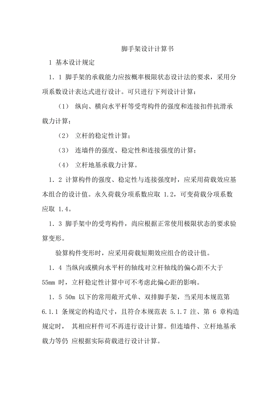 脚手架设计计算书1 基本设计规定1.1 脚手架的承载能力应按概率极限状态设计法的要求,采用分 项系数设计表达式进行设计可只进行下列设计计算:(1) 纵向、横向水平杆等受弯构件的强度和连接扣件抗滑承 载力计算;(2) 立杆的稳定性计算;(3) 连墙件的强度、稳定性和连接强度的计算;(4) 立杆地基承载力计算1.2 计算构件的强度、稳定性与连接强度时,应采用荷载效应基 本组合的设计值永久荷载分项系数应取 1.2,可变荷载分项系数 应取 1.41.3 脚手架中的受弯构件,尚应根据正常使用极限状态的要求验 算变形验算构件变形时,应采用荷载短期效应组合的设计值1.4 当纵向或横向水平杆的轴线对立杆轴线的偏心距不大于 55mm 时,立杆稳定性计算中可不考虑此偏心距的影响1.5 50m 以下的常用敞开式单、双排脚手架,当采用本规范第 6.1.1 条规定的构造尺寸,且符合本规范表 5.1.7 注、第 6 章构造规定时, 其相应杆件可不再进行设计计算但连墙件、立杆地基承载力等仍 应根据实际荷载进行设计计算1.6 钢材的强度设计值与弹性模量应按表5.1.6 采用钢材的强度设计值与弹性模量(N/mm2)表5.1.65.1.7 扣件、底座的承载力设计值应按表5.1.7采用。