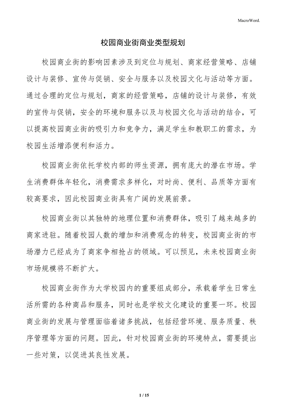 MacroWord.校园商业街商业类型规划校园商业街的影响因素涉及到定位与规划、商家经营策略、店铺设计与装修、宣传与促销、安全与服务以及校园文化与活动等方面通过合理的定位与规划,商家的经营策略,店铺的设计与装修,有效的宣传与促销,安全的环境和服务以及与校园文化与活动的结合,可以提高校园商业街的吸引力和竞争力,满足学生和教职工的需求,为校园生活增添便利和活力校园商业街依托学校内部的师生资源,拥有庞大的潜在市场学生消费群体年轻化,消费需求多样化,对时尚、便利、品质等方面有较高要求,因此校园商业街具有广阔的发展前景校园商业街以其独特的地理位置和消费群体,吸引了越来越多的商家进驻随着校园人数的增加和消费观念的转变,校园商业街的市场潜力已经成为了商家争相抢占的领域可以预见,未来校园商业街市场规模将不断扩大校园商业街作为大学校园内的重要组成部分,承载着学生日常生活所需的各种商品和服务,同时也是学校文化建设的重要一环校园商业街的发展与管理面临着诸多挑战,包括经营环境、服务质量、秩序管理等方面的问题因此,针对校园商业街的环境特点,需要提出一些对策,以促进其良性发展本文内容信息来源于公开渠道,对文中内容的准确性、完整性、及时性或可靠性不作任何保证。
