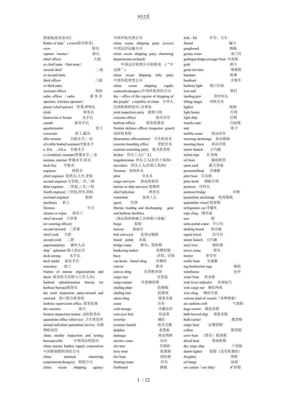 word船舶航海英语词汇Ranks of ship’s crew(船员职务)crew 船员 captain〔master〕 船长 chief officer 大副 or chief mate〔first mate〕 second chief 二副 or second mate third officer 三副 or third mate assistant officer 驾助 radio officer〔radio 报务员operator, wireless operator〕 purser (chief purser) 管事,事物长 clerk 事务员 boatswain or bosun 水手长 cassab 副水手长 quartermaster 舵工 coxswain 舵工,艇长 able seaman 全能水手,一水 a.b.(able bodied seaman)全能水手 e. D.h. , d.h.u. 全能水手 o.s.(ordinary seaman)普通水手,二水 seaman, mariner普通水手,海员 deck boy 甲板员 engineer 轮机员 chief engineer 轮机长,大车,老轨 second engineer大管轮,二车,二轨 third engineer 二管轮,三车,三轨 fourth engineer三管轮,四车,四轨 assistant engineer 轮助 mechanic 机工 fireman 生火 cleaner or wiper 清洁工 chief steward 大管事 (or catering officer) second steward 二管事 chief cook 大厨 second cook 二厨 supernumerary 额外人员 ship’splement船上的定员 deck serang 水手长 deck tindal 副水手长 seacunny 舵工 Names of marine organizations and their( 船务机关名称与工作人员) harbour administration bureau (or harbour bureau)港务局 the joint inspection party-inward and outward 进口联合检查组 harbour supervision office 港务监视 the customs 海关 frontier inspection station 边防检查站 quarantine office (s0ervice) 卫生检疫所 animal and plant quarantine service 动植物检疫所 china modity inspection and testing bureau(ccitb) 中国商品检验局 china marine bunker supply corporation 中国船舶燃料供给公司 china national chartering corporation(zhongzu) 租船公司 china ocean shipping agency 中国外轮代理公司 china ocean shipping pany (cosco) 中国远洋运输公司 china ocean shipping pany chartering department(coschard) 中国远洋轮船公司租船部 (“中远租〞) chian ocean shipping tally pany 中国外轮理货公司china ocean shipping supply corporation(supco.)中国外轮供给公司 the ~ office of the register of shipping of the people’s republic of china 中华人民国船舶检验局~办事处 joint inspection party 联检小组 customs officer 海关官员 harbour officer 港务监视员 frontier defence officer (inspector ,guard) 边防检查组 Quarantine officer(dotor) 卫生检疫员 customs boarding office 登轮官员 customs searching party 海关检查组docker 码头工人(广义) longshoreman 码头工人(在岸上装卸) stevedore 码头工人(在船上装卸) foreman 装卸队长 pilot 引水员 cargo surveyor 商品检验员 marine or ship surveyor验船师 chief tallyman 理货员 waterman 加水工人 agent 代理 Marine loading and discharging gear and harbour facilities〔海运装卸机械工具和港口设施〕barge 驳船 beacon 航标灯 belt conveyor 皮带运输机 board palnk 木版 bridge crane 桥吊,装卸桥 bunkering tanker 供燃料船 buoy 浮筒,浮标 can hook,barrel sling 吊桶钩 canvas 帆布 canvas sling 吊货帆布袋 cargo tray 吊货盘 cargo runner 吊货钢丝绳 chafing plate 防擦板 chafing mat 防擦席 chain sling 链条吊索 crane 吊车 cold storage 冷藏仓库 conveyor belt 传送带 crowbar 撬杠 customs launch 海关关艇 dolphin 系缆桩 dunnage 垫仓物料 electric crane 电吊 elevator 升降机 ferry boat 轮渡船 fire boat 消防船 floating crane 浮吊 footboard 踏板 fork - lift 铲车,叉车 funnel 漏斗 gangboard 跳板 gantry crane 龙门吊 garbage(sludge,sewage) boat 垃圾船 grab 抓斗 grain elevator 吸粮机 hammer 铁锤 handcart 手推车 harbour light 港口灯标 iron nail 铁钉 landing pier 登岸码头 lifting maget 西铁吊具 lighter 驳船 light house 灯塔 light ship 灯船 manila rope 白棕绳 mat 席子 mobile crane 流动吊车 mooring anchorage 系泊锚地 mooring buoy 系泊浮筒 motor launch 小汽艇 nylon rope 尼龙绳 oil hose 输油软管 open yard 露天货场 personnelboat 交通艇 pilot boat 引水船 plate hook 钢板吊钩 pontoon 浮码头 pontoon bridge 浮桥 quarantine anchorage 检疫锚地 quarantine vessel检疫船 refrigerator car冷藏车 rope sling 绳吊索 saw 锯 semi-portal crane 半门吊 shifting board 防动板 signal tower 信号台 steam launch 小汽艇 steel wire 钢丝绳 tower crane 塔吊 tractor 牵引车 traffic boat 交通艇 tug boat(motor tug) 拖轮 warehouse 仓库 water boat 供水船 watr lever indicator 水深标尺 wire cargo net 钢丝网络 wire sling 钢丝吊索 various kind of vessels〔各种船舶〕air cushion craft 气垫船 bage-carrier 载驳货船 bulb-bowed ship 球鼻首船 bulk-carrier 散货船 cargo liner 定。