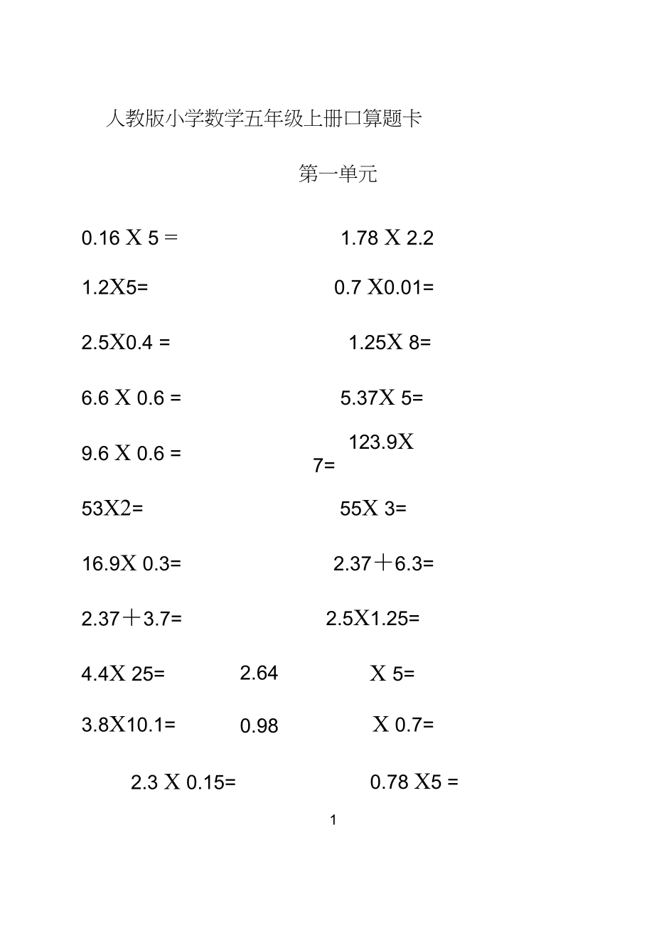 0.78 X5 = 人教版小学数学五年级上册口算题卡 0.16 X 5 = 1.78 X 2.2 1.2X5= 0.7 X0.01= 2.5X0.4 = 1.25X 8= 6.6 X 0.6 = 5.37X 5= 9.6 X 0.6 = 123.9X 7= 53X2= 55X 3= 16.9X 0.3= 2.37+6.3= 2.37+3.7= 2.5X1.25= 4.4X 25= 2.64 X 5= 3.8X10.1= 0.98 X 0.7= 第一单元 2.3 X 0.15= 5X 0.78 = 5.3 X 42= 5.24 X 0.99= 10.65 X 0.22= 1X 0.125= 0.125 X 11= 4.39X 10= 4.39 X 0.1= 0.7X2 3= 0.47 X 0.7= 0.7X0.57= 3 X 1.21= 12X 0.03= 0.03 X 0.12= 3X 0.121= 8.6 X 0.7= 7.6 X 0.23= 16.73 X 2.5= 8.53X0.99 = 7.3 X 5= 5.8X0.29= 5.8 X 2.9= 8.6 X 18= 1.42 X 18= 1.4 X 15= 0.1 X 0.2 = # 3.57 X 5= 4.2 X 0.1 = 99X 0.35 = 0.05 X 0.8 = 1.23 X 3= 0.36 X 12= 7.5X2.5X4= 1.7 X 0.43 = 1.2 X 0.4= 1.3 X 0.4= 5.43X 0.86= 78.58 X 3.7= 0.85X 1.01 = 5.29 X 2.3= 0.1 X 0.01 = 0.28 X 35= 4.68X 4.5= 0.25 X 0.5= 2.5 X 1 .25= 25.7 X 3.29= 6.71 X 25.7= 6.5 X 5 6.5= 1X 0.85= 4.73 X 3.9= 47.3 X3.9= 47.3 X 0.391 = # 0.473 X 0.39 = 2.4 X 5= 1X 1.25= 0.45 X 0.09= 6.2X0.03= 0.125 X 0.125= 9.9X2.5X0.4= 9 X 0.18 = 0.25X 16= 0.7 X 8 = 3.05X 4= 6.8 X 2 = 5.2X3.05X 4.8= 1.05 X 0.1 = 17.5X 7.5X 2= 4.2 X 21= 10.81X 4.6 X 0.18= 0.65 +3.48+0.45= 46.3X 33.5+46.3X 66.5= 10.48 X 0.94= 47X 1.2= 5.64 -2.1= 1.25X 80= 0.77 X 1.1= 1.2-0.08= 8- 0.52= # 5.0.8 X 0.92= 1.2 X 3.6= 1.4 X 1.2= 5.6X 0.9 = 8.2 X1.1 = 0.7X5=_ 3.5X 1 .6= 0.27 X 0.036= 0.1 X 250= 6.64 X 3.3= 12.5X 88 = 4.2 X 0.7 X 6= 10.2X 35 = 5.6 X 3.5= 7.2X 48 = 52X 7.2 = 16.7-0.92-1.08 = 16.8+1.6= 1.8 X 4.5 = 3.8+5.6= 0.7X 4 = 1.8+0.28 = 13.5X 6 = 5.04 X 2.1 22.6X 0.33= 3.25 X 0.98 0.75X 0.5= 0.75X2.3 = 3.5X0.1 = 3.6 X 0.09= 200X0.04= 12-1.2 = 1.3X0.5= 0.42 X 0.6 = 3.2X0.5= 0.21 X0.3= 2.5-1.37= 5.5 X 11= 0.73X 2.15= 7.38X1.6= 8.4 X 0.26= 5.5 X 17.3 = 6.7 X 5.5 = 0.5 X 0.7 = 0.8 X 3.2= 1 .5X 4 = 5X 4.8 = 0. 75+ 0. 8= # OX 4.8 = 77 X 7.7 = 5.4X10= 3.2X100= 3.6 X 0.1 = 1.2X0.3= 8.5X1.7= 9.782X 3.2 = 8.76+0.351 = 1.58+2.42= 1.25 X 4= 3.9 +2.7 = 2.5 X 4= 4.2 X1000= 0.45 X 0.15= 0.18X0.3= 0.49 X 0.7 = 0.04 X 25= 53.73 -17.49= 42.4 +7.6 = 7.8 -5.6 = 7.8 X 0.5 = 0.24 X0.3= 0.3X 10= 12-3.8 = 8.1 — 0.05 = 0.24 X 0.3 = 0.2 X 0.5 = 2.5 X 3= 4.4X(5X 0.2)= 7X 1.3= 0.96X 0.06= 0.36X 0.3= 0.35X 0.7= 4X0.8X0.25 X1.25= 13 +0.7X 0.7= 4X 0.5= 7X2.1= 8.89+0.1= 24 X 0.25= 0.1 X0.01= 2.4X 0.8= 9X 0.4= 10X 0. 01= 30.2-3.02= 4.3-0.25= 1-O.82= 9.6 X O.3= # 0.1 X 6.7= 1.6 X 0.5= 4.8 X 0.4= 5.4+4.6 2= 9-3.2 = (1.5+2.4) X 0.2= 1.7+1.3 X 0.4= 3.6 X2 3.6= 8.5 X 0.5+0.6= 7.2 X 0.8= 5.4 X 0.6= 9.5 X 0.1 = 10X 2.5= 35 X 0.05= 0.64 X 0.4= 2.5 X 0.5= 6.45 X 0.01= 0.36 X 0.03= 0.01 X 0.2= 0.08 X 0.001 = 7.5 X 2.5= 8.8 X 0.2= # 0.96 X 6= 0.75 X 0.5= 2.5 X 4= 0.74X 0.4= 小学数学五年级上册第二单元口算题卡 7.5X 3= 3.74X 0= 0.8 X 0.6= 0.05X 0.08= 80X 1.25= 0.13X7= 3.5X 4= 2.8X 0.5 3.5 X 200= 1.5 -0.06= 0.75 - 15= 0.4 X 0.8 = 4X 0.25= 0.36 +1.54 = 1.01 X 99= 420 十35= 17X 40= 100 -63= 3.2+1.68= 2.8 X 0.4 = 1.92 - 0.04= 0.32 X 500= 0.65+4.35= 10 - 5.4 = 4宁 20= 3.5 X 200= 1.5 -0.06 = 0.75 宁15= 0.4X0.8= 4 X 0.25= 1.01 X 99= 420 十35= 1235- 0.05= 0.64 - 0.4= 2.5 - 0.5= 6.45 - 0.01 = 0.36 - 0.03= 0.08 - 0.001 0.01 - 0.2= 7.5 - 2.5= 8.8 - 0.2= 0.96 - 6= 0.75 - 0.5= 0.7X 5= 0.08 X 1000= 0.1 X 6.7= # 1.6 X 0.5= 2.5X 4= 7.5X 3= 0.8X 0.6= 80X 1.25= 3.5X 4= 4X 0.5= 7.16X0.4= 2.6 - 2= 8.1 X 2.5= 9.6 - 4.8= 2X3.1= 0.125X8= 0.74 X 0.4= 3.74X 0= 0.05X 0.08= 0.13X7= 2.8 X 0.5 - 2= 8.2+2.6= 125X 0.8= 3.4X 4X 0.25= 5.5X 2= 3-1.5X2= 2.4X 0.5= # 0.48 - 6= 6.4 -4= 3.25+0.75= 0.9 - 0.1 = 0.25 X 4= 4.8 - 8= 0.5+0.5 宁 0.5= 50X 0.8= 10X 0.05 = 0.13 X 7 = 0.21 X 100= 0.7 X 4= 0.05 X 4= 4 X0.3= 12.5X 8= 2.3 X 4= 3.25X 0= 2.6 X 3= 7.5X0.1 = 1.25 -0.25 0X 9.8 = 3 宁4 = 3.5 X 0= 1 X 0.06 = 2.6X3= 7.5 X 0.1 = 0.6 - 3+3= 0.91 - 13= 9X 0.5 = 8.2 +1.8= 2.4 X 5 = 3.99 X1= 8.4 - 7 = 8.4 * 0.7 = 0.34 - 0.17 = 30.4 * 4= 1.2 X 6 = 0.72 * 0.6 = 2.6 - 1.3 = 0.6 X0.3= 0* 3.65 = 7.82 *1 = 0.001 * 0.1 = 1.4 * 0.7 = 3.6*0.06= 5.6 *0.9= 5.6*1.4= 0.48 * 0.8 = 4.4*0.11 = 4.2 X3 = 3.2X0.4= 0.3 * 0.01 = 4*0.5= 5.1 *0.17= 0.28 - 1.4 = 0.9 -0.45 = 9.6 - 16= 1 -0.01 = 0.01 - 1 = 7.5 宁 1.5 = 0.81 - 9= 3 宁 0.5 = 10-25 = 4.8 -0.16 = 0十 3.89 = 3.52 宁1 = 37.2X 99+37.2= 6.4 宁4 = 1.5 宁 0.3 = 1 X 0.4 - 1X 0.4= 小学数学五年级上册第三单元口算题卡 1.8X5= 7.2 -0.9 = 25X 4-0.25 X 4= 2.2 X 6= 8.4 - 0.4 = 9 -5-9-5= 2.5 X 2.8= 9-3.2 X 0.8= # 0.85 X 0.5+4.6= 5.9-4.3= 4.2+5.8-3.4= 0X 5.8= 0.36X 0.9= 2.5X 0.5= 0.05 X0.8= 0.36 X12= 1.2 X 0.4+1.3= 1.2X0.5 -0.4 = 1.2 X 5X 8 = 1.6+2.4 X0.3 = 1.62X 0.4+2.5= 2.03X2-2.4= 0.9X 0.4+0.8= 7.5-0.9= 0.48+2X 6= 1.62X 0.4= 99X 0.35 = 1.23 X 3= 7.5 X 2.5 X 4 =