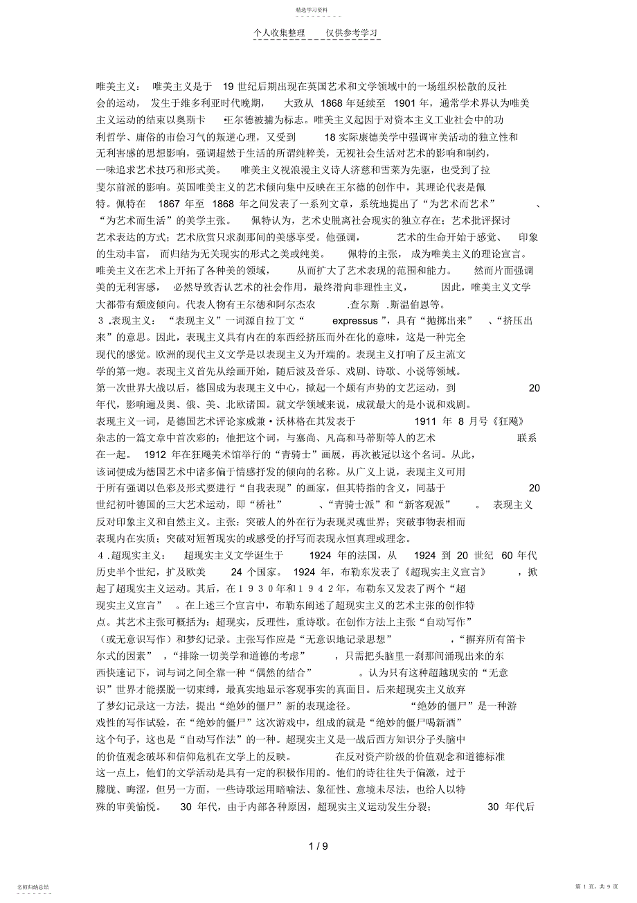 个人收集整理仅供参考学习1 / 9 唯美主义: 唯美主义是于19 世纪后期出现在英国艺术和文学领域中的一场组织松散的反社会的运动, 发生于维多利亚时代晚期,大致从 1868 年延续至1901 年,通常学术界认为唯美主义运动的结束以奥斯卡· 王尔德被捕为标志唯美主义起因于对资本主义工业社会中的功利哲学、庸俗的市侩习气的叛逆心理,又受到18 实际康德美学中强调审美活动的独立性和无利害感的思想影响,强调超然于生活的所谓纯粹美,无视社会生活对艺术的影响和制约,一味追求艺术技巧和形式美唯美主义视浪漫主义诗人济慈和雪莱为先驱,也受到了拉斐尔前派的影响英国唯美主义的艺术倾向集中反映在王尔德的创作中,其理论代表是佩特佩特在1867 年至 1868 年之间发表了一系列文章,系统地提出了“为艺术而艺术”、“为艺术而生活”的美学主张佩特认为,艺术史脱离社会现实的独立存在;艺术批评探讨艺术表达的方式;艺术欣赏只求刹那间的美感享受他强调,艺术的生命开始于感觉、印象的生动丰富, 而归结为无关现实的形式之美或纯美佩特的主张, 成为唯美主义的理论宣言唯美主义在艺术上开拓了各种美的领域,从而扩大了艺术表现的范围和能力然而片面强调美的无利害感, 必然导致否认艺术的社会作用,最终滑向非理性主义,因此,唯美主义文学大都带有颓废倾向。