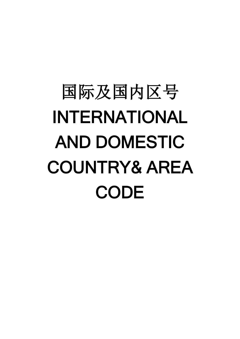 国际及国内区号INTERNATIONAL AND DOMESTIC COUNTRY& AREA CODE国家与城市代码目的地 国家/地区代码 目的地 国家/地区代码阿尔及利亚 213 中国 86阿根廷 54 中华人民共和国 澳大利亚 61 哥伦比亚 57阿得雷德 618 波哥大 571布理斯班 617堪培垃 6162 哥斯达黎加 506达尔文 6189墨尔本 613 塞浦路斯 357帕斯 619 法马古斯塔 3573悉尼 612 尼科西亚 35721 奥地利 43 捷克斯洛伐克 42因斯布鲁克 43512 布拉格 422萨尔斯布鲁克 43662 斯洛伐克 427/9维也纳 43222 丹麦 45巴哈马群岛 1809 奥尔堡 458 哥本哈根 451巴林 973 欧登塞 456 孟加拉国 880 多米尼加 1809 达卡 8802 厄瓜多尔 593巴巴多斯 809 基多 5932 比利时 32 埃及 20安特卫普 323 开罗 202布鲁塞尔 322 埃塞俄比亚 251百慕达 1809 斐济 679博茨瓦纳 267 芬兰 358巴西 55 赫尔辛基 3580巴西利亚 5561 里约日内卢 5521 法国 33圣保罗 5511 巴斯地亚 3395文莱 673 巴瑞兹 3359 波尔多 3356加拿大 1 戛纳 3393卡尔加里 1403 沙木尼 3350埃德蒙顿 1403 多佛 3331蒙特利尔 1514 格勒诺布尔 3376亚加拉瀑尔 1416 勒阿弗尔 3335渥太华 1613 马赛 3391魁北克 1418 蒙比利尔 3367多伦多 1416 尼斯 3393范库弗峰 1604 巴黎 331温尼伯湖 1204 斯特拉斯堡 3388智利 56 凡尔赛 335圣地亚哥 562国家与城市代码目的地 国家/地区代码 目的地 国家/地区代码德国 49 意大利 39 柏林 4930 波化亚 3951 波恩 49228 佛罗伦萨 3955 不来梅 49421 热那亚 3910 杜塞尔多夫 49421 米兰 392 法兰克福 4969 那不勒斯 3981 汉堡 4940 巴勒莫 3991 汉诺威 49551 罗马 396 莱比锡 49341 都灵 3911 科隆 49221 梵蒂冈 396 慕尼黑 4989 威尼斯 3941 斯图加特 49771 日本 81直布罗陀 350 福冈 8192 广岛 8182/11希腊 30 北九州 8193 雅典 301 神户 8178关岛 671 京都 8175 长崎 81958危地马拉 502 成田 81476 危地马拉城 5022 名古屋 8152 大阪 816圭亚那共和国 592 札幌 8111 乔治敦 5922 东京 8133 圭亚那法国 594 横滨 8154 洪都拉斯 504 。