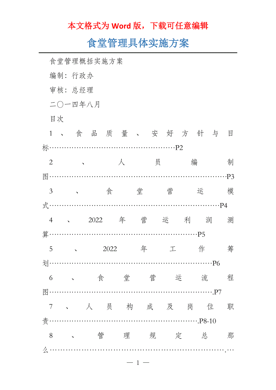 本文格式为Word版,下载可任意编辑食堂管理具体实施方案 食堂管理概括实施方案 编制:行政办 审核:总经理 二〇一四年八月 目次 1、食品质量、安好方针与目标……………………………………………P2 2、人员编制图………………………………………………………………P3 3、食堂营运模式……………………………………………………………P4 4、2022年营运利润测算……………………………………………………P5 5、2022年工作筹划…………………………………………………………P6 6、食堂营运流程图………………………………………………………….P7 7、人员构成及岗位职责…………………………………………………….P8-10 8、管理规定总那么………………………………………………………….…P11-14 9、食堂卫生制度………………………………………………………….….P15-16 10、食物中毒及其预防………………………………………………………P17 11、厨房急救预防……………………………………………………………P18 12、安好防火制度……………………………………………………………P19 13、就餐管理制度……………………………………………………………P20-21 14、购买验收管理制度………………………………………………………P22 15、厨房考核制度……………………………………………………………P23-24 16、财务管理规定……………………………………………………………P25 食品质量、安好方针与目标一、食堂方针: 顾客至上质量为本共享真健康 二、食品质量、安好目标 1、客户合意度≥80分; 2、食物中毒事故:0 3、员工合理投诉: 4、投诉解决率:100%。