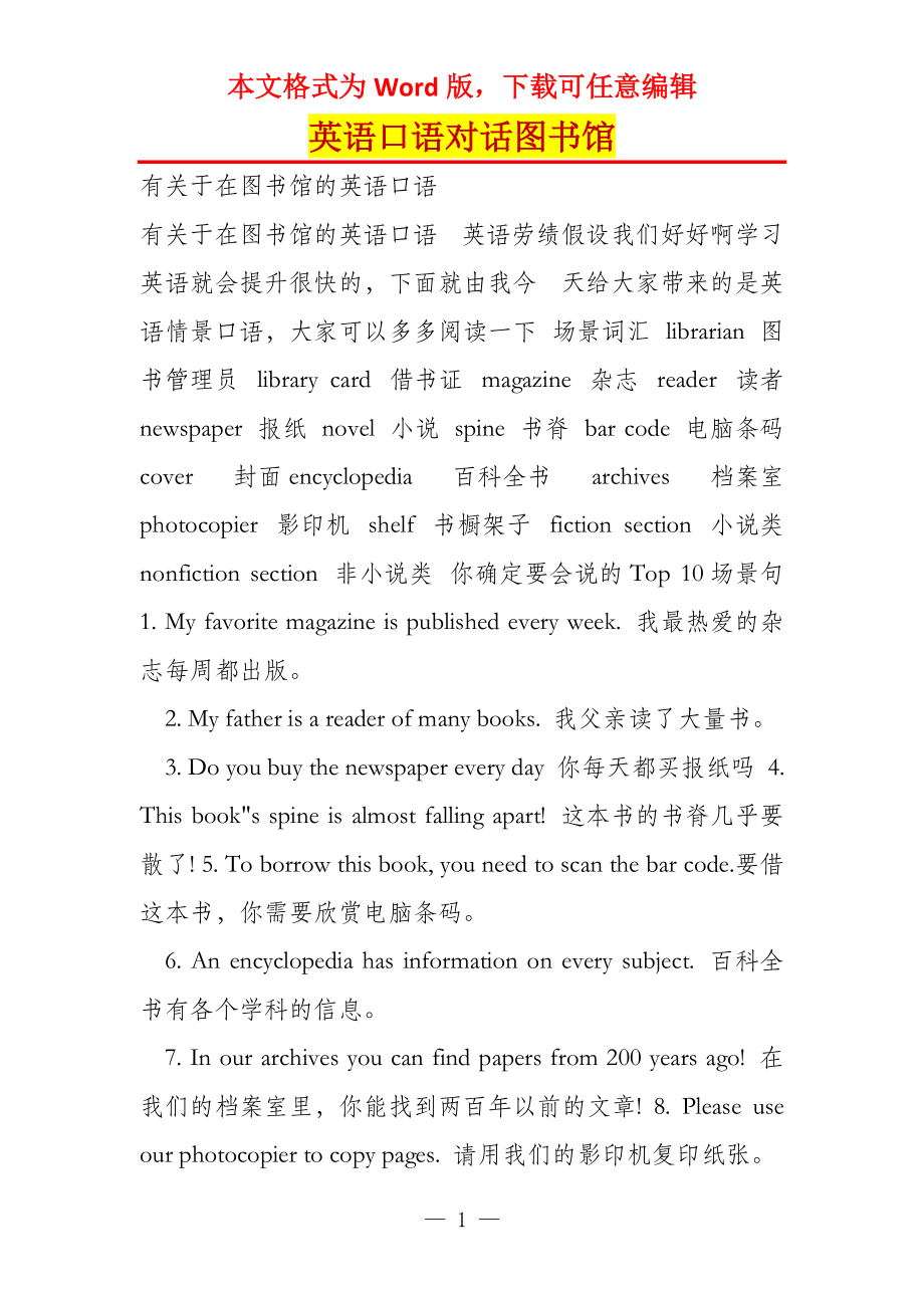 本文格式为Word版,下载可任意编辑英语口语对话图书馆有关于在图书馆的英语口语有关于在图书馆的英语口语 英语劳绩假设我们好好啊学习英语就会提升很快的,下面就由我今 天给大家带来的是英语情景口语,大家可以多多阅读一下 场景词汇 librarian 图书管理员 library card 借书证 magazine 杂志 reader 读者 newspaper 报纸 novel 小说 spine 书脊 bar code 电脑条码 cover 封面encyclopedia 百科全书 archives 档案室 photocopier 影印机 shelf 书橱架子 fiction section 小说类 nonfiction section 非小说类 你确定要会说的Top 10场景句 1. My favorite magazine is published every week. 我最热爱的杂志每周都出版 2. My father is a reader of many books. 我父亲读了大量书 3. Do you buy the newspaper every day 你每天都买报纸吗 4. This book"s spine is almost falling apart! 这本书的书脊几乎要散了! 5. To borrow this book, you need to scan the bar code.要借这本书,你需要欣赏电脑条码。