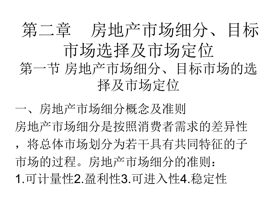 第二章 房地产市场细分、目标市场选择及市场定位第一节 房地产市场细分、目标市场的选择及市场定位一、房地产市场细分概念及准则房地产市场细分是按照消费者需求的差异性,将总体市场划分为若干具有共同特征的子市场的过程房地产市场细分的准则:1.可计量性2.盈利性3.可进入性4.稳定性二、房地产细分市场的变量1.人口变量(1)家庭类型(2)收入变量(3)职业变量(IT业、金融业、艺术家、教师、律师、医生、中层白领雇员、独立创业者、大型公司高级职员、体力劳动者)(4)社会阶层住宅消费的社会阶层的五种层次:遮风避雨消费层次基本安置消费层次经济适用消费层次舒适消费层次豪华高档消费层次2.心理变量指人们购买住宅的动机、生活方式以及个性等1)购买动机(居住、馈赠、投资、炫耀)(2)生活方式 案例:生活方式催生海边别墅 中国的海岸资源非常稀缺,人均海岸线不到2厘米而随着国内“9+3”、“5+2”候鸟式和钟摆式休闲方式的兴起,中国的海滨度假地产已经进入了全面发展阶段的确,一些人早已不拘泥于满足城市之家和郊区别墅,他们更重视能让身心真正得到放松的居所 3.行为变量行为变量是指消费者对产品的知识、态度、使用或反应。