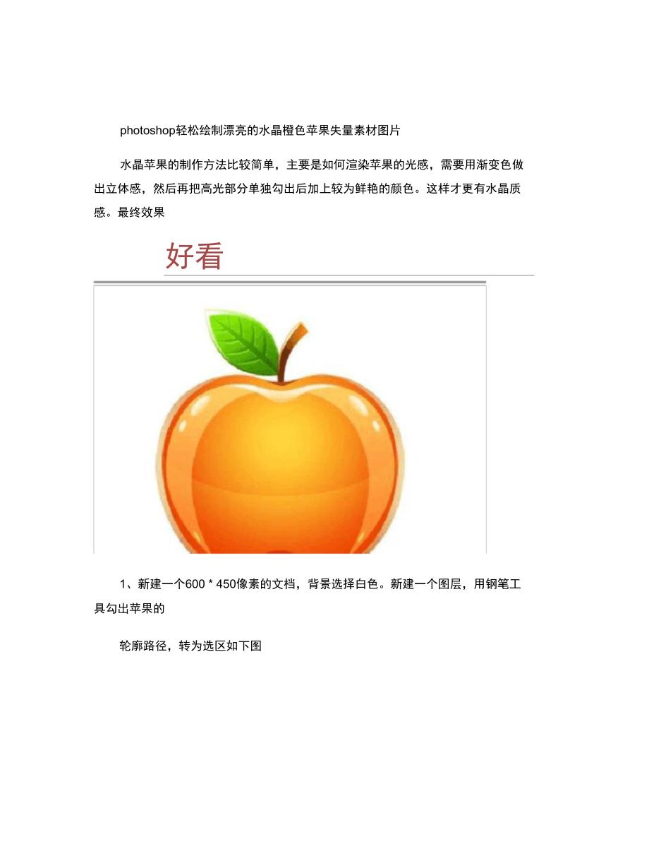 photoshop轻松绘制漂亮的水晶橙色苹果失量素材图片水晶苹果的制作方法比较简单,主要是如何渲染苹果的光感,需要用渐变色做 出立体感,然后再把高光部分单独勾出后加上较为鲜艳的颜色这样才更有水晶质 感最终效果好看1、新建一个600 * 450像素的文档,背景选择白色新建一个图层,用钢笔工具勾出苹果的轮廓路径,转为选区如下图FS爱好者仃 03 冷A#E3A570#F0D69E#046431<图1>2、选择渐变工具,颜色设置如图2,由上至下拉出图3所示的线性渐变FS爰好者<图2>PS爰好者3<图3>3、新建一个图层,用钢笔勾出图4所示的选区,选择渐变工具,颜色设置如 图5,拉出图6所示的径向渐变PS爱好者<图FS爰好者<图5>4>5<图6>4、新建一个图层,用钢笔工具勾出图 7所示的选区,拉上图8所示的线性渐PS爱好者S#FDCC5D #F87A2D^6<图PS爱好惹7><图8>5、把当前图层复制一层,执行:编辑 > 变换 > 水平翻转,放到苹果的右边, 效果如下图PS爱好者<图9>6回到径向渐变图层如下图,用钢笔工具勾出下图所示的选区,按 Ctrl + J把选区部分图片复制到新建的图层,按 Ctrl + Shift + ]置顶,图层混合模式改为 滤色”不透明度改为:30%,效果如图11PS爱好者|图层汽助作匮道{&径IE最 ]滤色 三]不透明度:E 融定填充:E- F |图层3團层6<图PS爰好者圉层3副本锁定;0川田0 埴充:丽」国建F作匾道矗径记最.|滤色 习不透軀:)3^團层7副本E10>< 图 11>7、用钢笔勾出下图所示的选区,填充颜色: #D93307,按Ctrl + Alt + G与前一图层编组,如下图0画隣ps爱好忑也:厚 77 W9< 图 12>8、用钢笔工具勾出图13所示的选区,拉上图14所示的线性渐变。