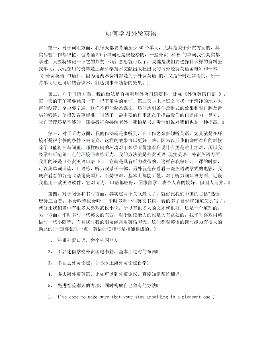 另外就是在看看一些英语教学式的电影,我现在看看的就是《踏遍美国》,不是很难,基本上都能听懂对于听力同口语方面,近段我也用一款英语软件,它对听力,口语都较好,图像自学,我个人真的较好,但因人而异 第四,对于阅读和书写方面,其实这两个关联最大了,就好比我们中国的古话"熟读唐诗三百首,不会吟诗也会吟!“平时多看一些英文书籍,看的多了自然就知道怎么写了,就好比我们当中有很多人喜欢武侠小说,所以有很多人的文才就很好,这是一个道理的,另一方面,平时多写一些英文的东西,对于阅读能力的也是大有益处的,我平时喜欢用英语写一些小随笔,而且我与我的朋友经常用英语聊天这些都对英语的读写能力有很大的助益的!一定要记住一点,英语的读和写是相辅相成的 1, 注重外贸口语,缴个外国朋友 2, 不要迷信学校外贸函电书籍,基本上过时的东西 3, 多回去外贸论坛,如 fob 上海外贸论坛自学 4, 多去用外贸英语,比如可以到外贸论坛,百度知道帮忙翻译 5, 先进经验别人的方法,同时构成自己独有的方法 1、 i've come to make sure that your stay inbeijing is a pleasant one. 我特地为你们精心安排并使你们在北京的停留开心。