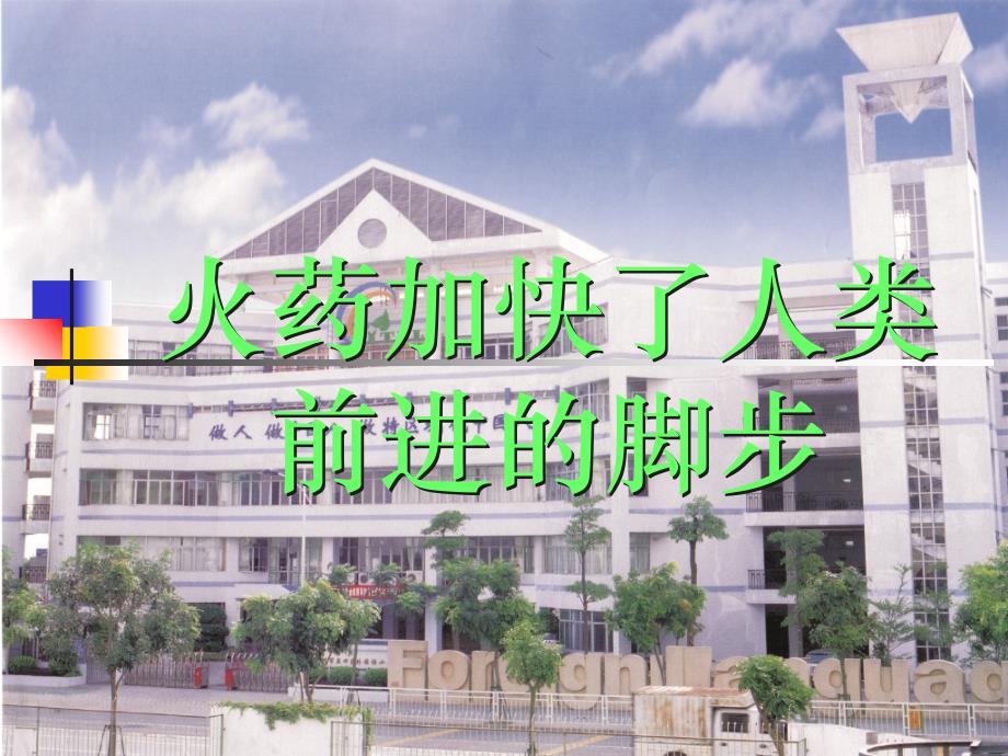 火药加快了人类火药加快了人类前进的脚步前进的脚步 炼丹术炼丹术硝、硫、炭硝、硫、炭 火药是我们祖先发明的,距今已有一千多年了火药的研究开始于古代炼丹术,古人为求长生不老而炼制丹药,炼丹术的目的和动机都是荒谬和可笑的,但它的实验方法还是有可取之处,最后导致了火药的发明 恩格斯高度评价了中国在火药发明中的首创作用:““现在已经毫无疑义地证实了,火药现在已经毫无疑义地证实了,火药是从中国经过印度传给阿拉伯人,又由阿拉伯是从中国经过印度传给阿拉伯人,又由阿拉伯人和火药武器一道经过西班牙传入欧洲人和火药武器一道经过西班牙传入欧洲火药的发明大大的推进了历史发展的进程,是欧洲文艺复兴的重要支柱之一 1332年的铜火铳,是世界上现存最早的有铭文的管状火器实物突火枪突火枪又被称为突火筒,用粗竹子做的武器,里面装着许多铁做的子弹当火药燃烧结束时,这些子弹便飞了出去,射杀敌人突火枪的发明,为射击性管型火器使用子弹开了先河,后来便逐步改进为枪这是世界上最早的原始步枪它的出现是火器制造历史上划时代的进步到了元明之际,这种用竹筒制造的原始管状火器改用铜或铁,铸成大炮,称为““火铳火铳””。