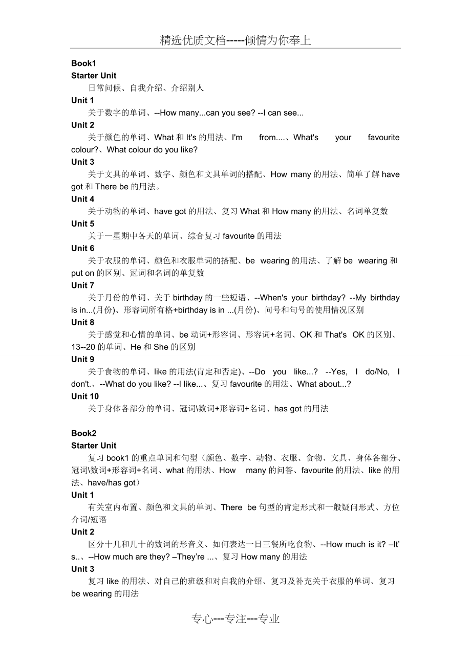 精选优质文档-----倾情为你奉上Book1 Starter Unit 日常问候、自我介绍、介绍别人Unit 1关于数字的单词、--How many...can you see? --I can see...Unit 2关于颜色的单词、What和Its的用法、Im from....、Whats your favourite colour?、What colour do you like?Unit 3关于文具的单词、数字、颜色和文具单词的搭配、How many的用法、简单了解have got和There be的用法Unit 4关于动物的单词、have got的用法、复习What和How many的用法、名词单复数Unit 5关于一星期中各天的单词、综合复习favourite的用法Unit 6关于衣服的单词、颜色和衣服单词的搭配、be wearing的用法、了解be wearing和put on的区别、冠词和名词的单复数Unit 7关于月份的单词、关于birthday的一些短语、--Whens your birthday? --My birthday is in...(月份)、形容词所有格+birthday is in ...(月份)、问号和句号的使用情况区别Unit 8关于感觉和心情的单词、be动词+形容词、形容词+名词、OK和Thats OK的区别、13--20的单词、He和She的区别Unit 9关于食物的单词、like的用法(肯定和否定)、--Do you like...? --Yes, I do/No, I dont.、--What do you like? --I like...、复习favourite的用法、What about...?Unit 10关于身体各部分的单词、冠词\数词+形容词+名词、has got的用法Book2 Starter Unit 复习book1的重点单词和句型(颜色、数字、动物、衣服、食物、文具、身体各部分、冠词\数词+形容词+名词、what的用法、How many的问答、favourite的用法、like的用法、have/has got)Unit 1有关室内布置、颜色和文具的单词、There be句型的肯定形式和一般疑问形式、方位介词/短语Unit 2区分十几和几十的数词的形音义、如何表达一日三餐所吃食物、--How much is it? –It’s..、--How much are they? –They’re ...、复习How many的用法Unit 3复习like的用法、对自己的班级和对自我的介绍、复习及补充关于衣服的单词、复习be wearing的用法Unit 4日常活动的单词和短语、关于亲人的单词、can/can’t的用法(陈述句、否定句和一般疑问句及其回答)Unit 5时间的表达、--What time is it? –It’s ....Unit 6介绍我的一位好朋友:My best friends name is .... Hes/Shes ... years old. His/Her favourite food is.... His/Her favourite drink is .... His/Her favourite colour is .... He/She has got a .... He/She can .... 、人称代词和形容词性物主代词的区别(He、His、She、Her)Unit 7关于动物的单词、介绍我喜欢的一种动物:My favourite animal is a .... It’s... (colour). It has got.... It lives.... It eats...(Its favourite food is....) It can ....、一般疑问句的提问规律和回答方式(用什么来问就用什么来答)Unit 8关于家具的单词、复习There be句型和方位介词/短语、描述我的教师和房间Unit 9关于游戏和图形的单词、一般疑问句和特殊疑问句的区别、特殊疑问词的辨析与使用Unit 10有关日常活动的单词和短语及其现在分词形式、现在进行时的构成和用法(陈述句、一般疑问句及其回答和特殊疑问句)、be动词在一般现在时中的变化、行为动词向现在分词转变的规则Book 3Unit 1日常活动的单词和短语、be going to do的肯定形式、一般疑问形式以及特殊疑问形式、特殊疑问词的辨析与使用、be动词在一般现在时中变化、时间状语的位置、简单介绍一般将来时Unit 2关于吉祥物的单词、have/has got和there be句型的使用和区别、have和has的辨析与使用(第三人称单数)Unit 3关于职业的单词、dream of 和dream that的辨析与使用、作文:My Day(I adv do sth. at some time、日常活动的单词和短语)Unit 4行为动词的第三人称单数变化规则以及其肯定和否定形式Unit 5关于时刻和时间的表达、--What time is it? –It’s ....Book4 Starter Unit 复习食物、运动、衣服、感觉、家具、收藏品、动物、身体各部分、颜色等单词、时刻的表达、My day、现在进行时、like+sth.的用法Unit 1关于科目的单词、like/love+doing、I want to be.../ I don’t want to be...Unit 2复习My Day、My Best Friend、favourite的用法、like/ love+sth./ doing sth.、have/has gotUnit 3关于自然景观的单词、复习如何描述一种动物以及一般疑问句的提问及回答规律(Book2 Unit7)Unit 4复习favourite的用法、be famous for sth./doing sth、be the capital of、复习行为动词的第三人称单数的肯定形式和否定形式Unit 5形容词的比较级和最高级、复习There be句型Unit 6东西方重要节日及其活动的表达Unit 7阅读一篇描述一个城市的短文、复习英文书信的格式、祈使句的用法、序数词的用法、复习形容词的比较级和最高级Unit 8祈使句以及描述如何走到某个地方Unit 9复习关于身体各部分的单词、一般过去时以及行为动词的过去式、when引导的时间状语从句Unit 10复习like/love doing的肯定形式和否定形式、复习行为动词的第三人称单数、复习作文My Best Friend、复习There be句型、复习favourite的用法、复习have/has got、复习be+(副词)+形容词、专心---专注---专业。