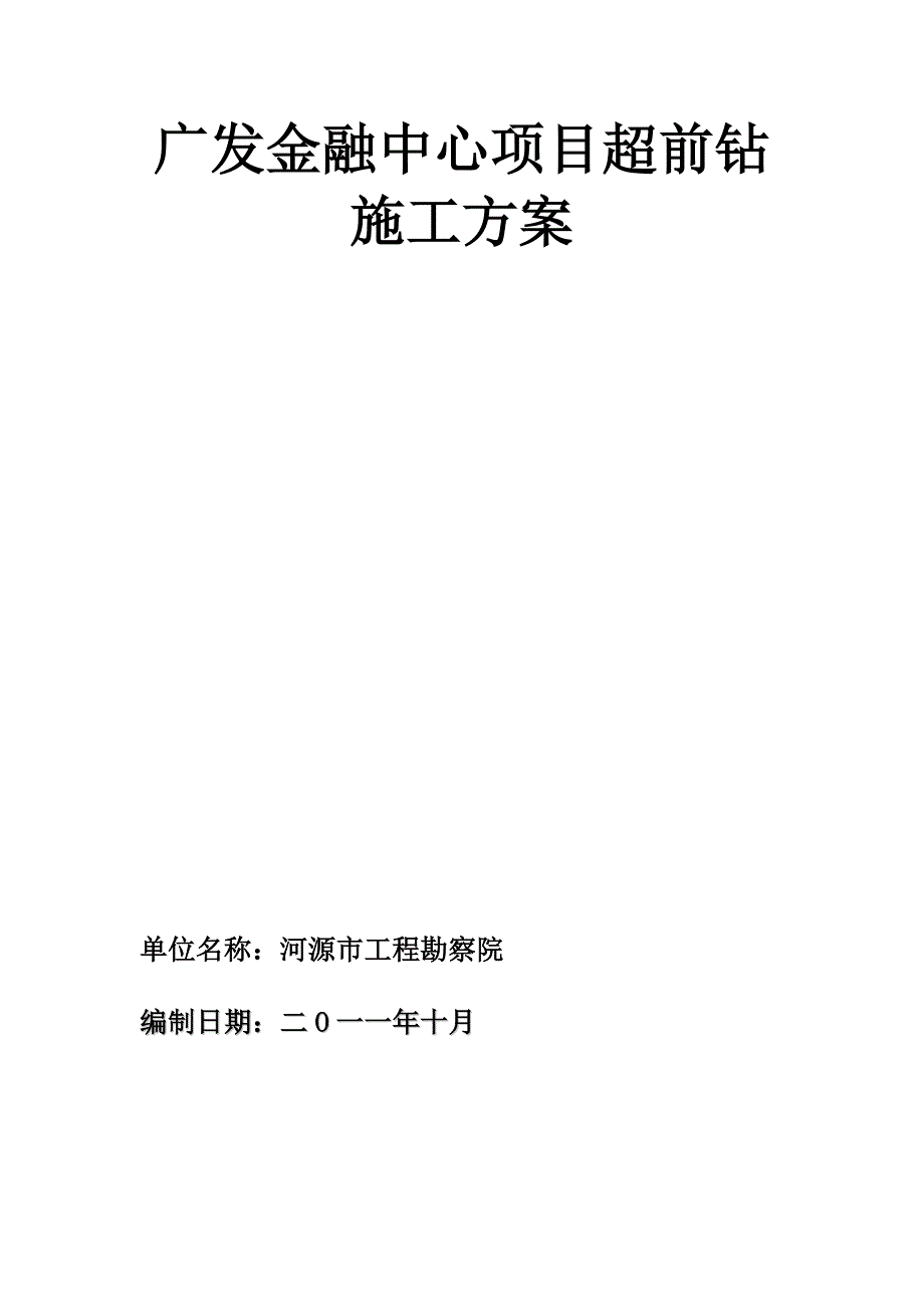 广发金融中心项目超前钻施工方案 单位名称:河源市工程勘察院 编制日期:二O一一年十月目 录 一、 超前钻初步工作方案 1(一)工程概况与勘察工作量 1(二)桩端持力层超前钻勘察工作方案 11、桩端持力层超前钻勘察方案 12、成果分析、勘察报告综合评价 53、报告编制 6二、重点、难点及合理化建议 7(一)超前钻勘察重点、难点 7(二)工作建议 7三、工作流程和工期进度计划 8(一)超前钻勘察工作流程 81、桩端持力层超前钻勘察流程详见下图(图1) 82、桩端持力层超前钻勘察阶段工期进度计划 9四、拟投入本项目的人员一览表 11五、拟投入本项目的仪器、设备一览表 12一、超前钻工作方案(一)工程概况与勘察工作量广发金融中心工程位于佛山市海七路东南边,占地面积约106535m2,拟建单栋99.6m以下、多栋23m以下,地下室一层,局部多层上部结构拟采用框架结构,拟采用桩基础,由于场地中出现软弱夹层发育,因此需增加超前钻勘察工作建议每桩均需进行超前钻勘察工作,按照广东省《建筑地基基础检测规范》(DBJ 15-60-2008);桩径1.2~1.6m的桩,不得少于1孔;桩径大于1.6m的桩,不得少于2孔。