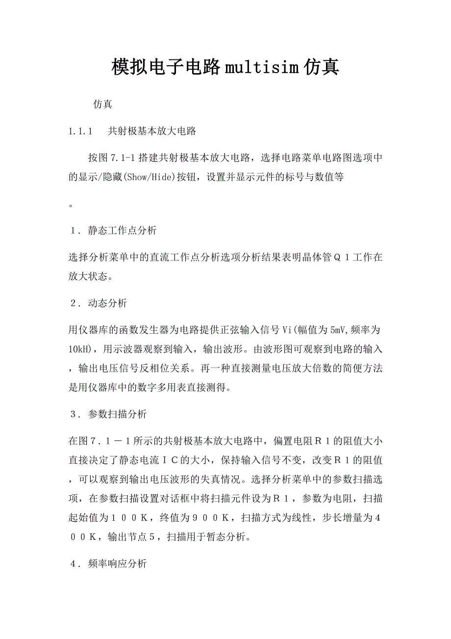 模拟电子电路multisim仿真 仿真 1.1.1 共射极基本放大电路 按图7.1-1搭建共射极基本放大电路,选择电路菜单电路图选项中的显示/隐藏(Show/Hide)按钮,设置并显示元件的标号与数值等 1. 静态工作点分析 选择分析菜单中的直流工作点分析选项分析结果表明晶体管Q1工作在放大状态 2. 动态分析 用仪器库的函数发生器为电路提供正弦输入信号Vi(幅值为5mV,频率为10kH),用示波器观察到输入,输出波形由波形图可观察到电路的输入,输出电压信号反相位关系再一种直接测量电压放大倍数的简便方法是用仪器库中的数字多用表直接测得 3. 参数扫描分析 在图7.1-1所示的共射极基本放大电路中,偏置电阻R1的阻值大小直接决定了静态电流IC的大小,保持输入信号不变,改变R1的阻值,可以观察到输出电压波形的失真情况选择分析菜单中的参数扫描选项,在参数扫描设置对话框中将扫描元件设为R1,参数为电阻,扫描起始值为100K,终值为900K,扫描方式为线性,步长增量为400K,输出节点5,扫描用于暂态分析 4. 频率响应分析 选择分析菜单中的交流频率分析项在交流频率分析参数设置对话框中设定:扫描起始频率为1Hz,终止频率为1GHz,扫描形式为十进制,纵向刻度为线性,节点5做输出节点。