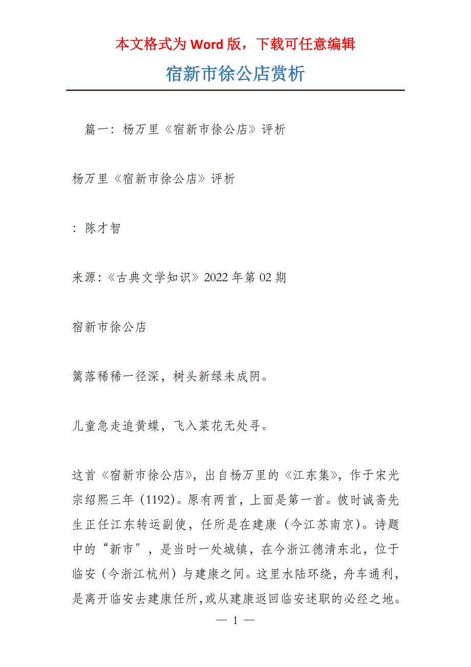 本文格式为Word版,下载可任意编辑宿新市徐公店赏析 篇一:杨万里《宿新市徐公店》评析 杨万里《宿新市徐公店》评析 :陈才智 来源:《古典文学知识》2022年第02期 宿新市徐公店 篱落稀稀一径深,树头新绿未成阴 儿童急走追黄蝶,飞入菜花无处寻。
