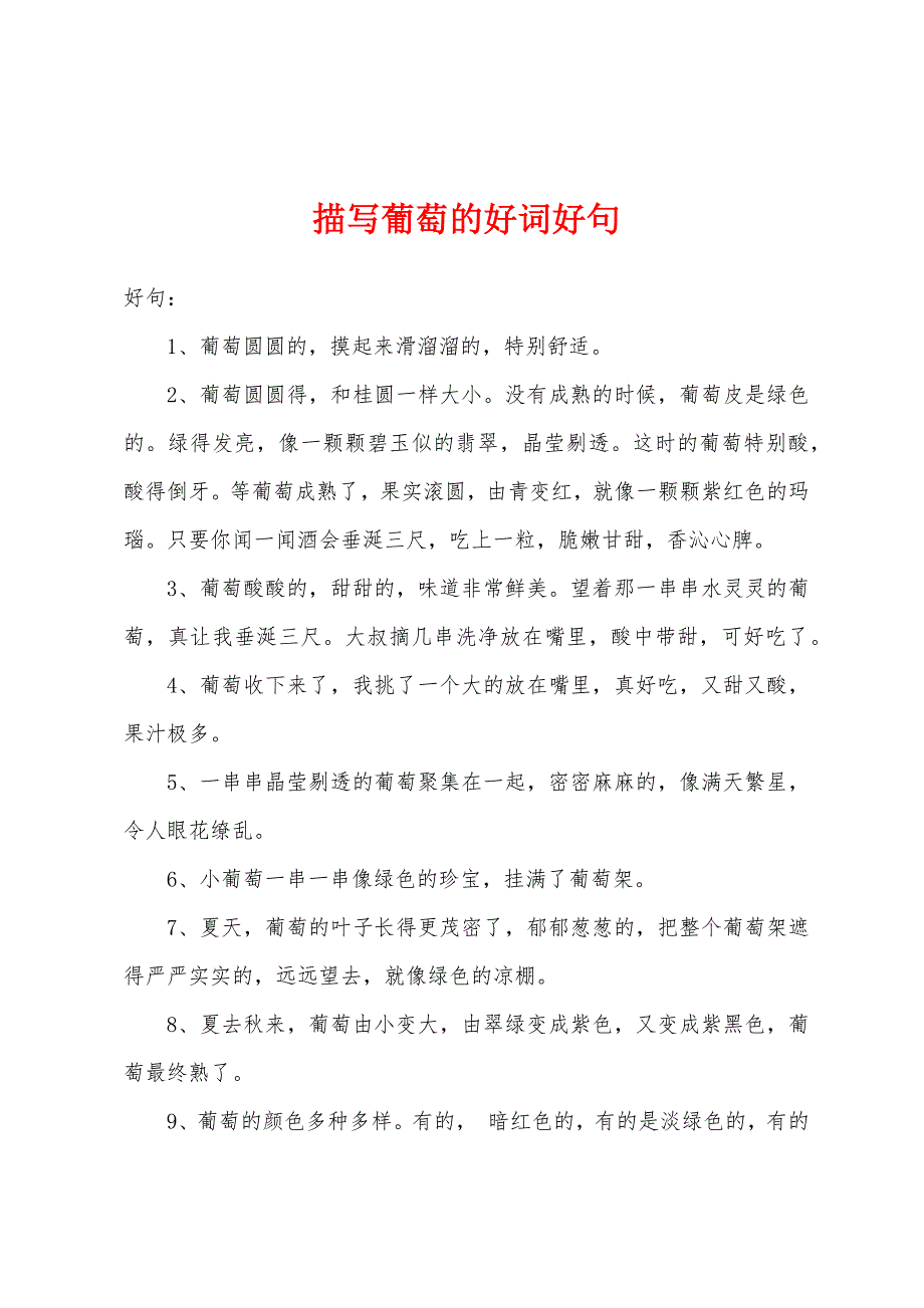 描写葡萄的好词好句好句: 1、葡萄圆圆的,摸起来滑溜溜的,特别舒适 2、葡萄圆圆得,和桂圆一样大小没有成熟的时候,葡萄皮是绿色的绿得发亮,像一颗颗碧玉似的翡翠,晶莹剔透这时的葡萄特别酸,酸得倒牙等葡萄成熟了,果实滚圆,由青变红,就像一颗颗紫红色的玛瑙只要你闻一闻酒会垂涎三尺,吃上一粒,脆嫩甘甜,香沁心脾 3、葡萄酸酸的,甜甜的,味道非常鲜美望着那一串串水灵灵的葡萄,真让我垂涎三尺大叔摘几串洗净放在嘴里,酸中带甜,可好吃了 4、葡萄收下来了,我挑了一个大的放在嘴里,真好吃,又甜又酸,果汁极多 5、一串串晶莹剔透的葡萄聚集在一起,密密麻麻的,像满天繁星,令人眼花缭乱 6、小葡萄一串一串像绿色的珍宝,挂满了葡萄架 7、夏天,葡萄的叶子长得更茂密了,郁郁葱葱的,把整个葡萄架遮得严严实实的,远远望去,就像绿色的凉棚 8、夏去秋来,葡萄由小变大,由翠绿变成紫色,又变成紫黑色,葡萄最终熟了 9、葡萄的颜色多种多样。