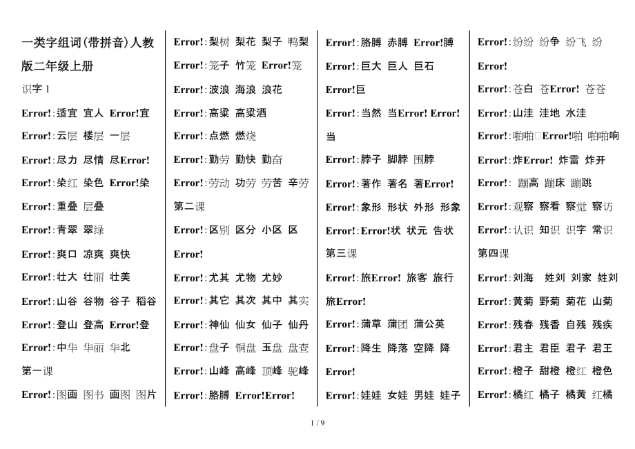 一类字组词(带拼音)人教版二年级上册识字1:适宜 宜人 宜:云层 楼层 一层:尽力 尽情 尽:染红 染色 染:重叠 层叠:青翠 翠绿:爽口 凉爽 爽快:壮大 壮丽 壮美:山谷 谷物 谷子 稻谷:登山 登高 登:中华 华丽 华北第一课:图画 图书 画图 图片:梨树 梨花 梨子 鸭梨:笼子 竹笼 笼:波浪 海浪 浪花:高粱 高粱酒:点燃 燃烧:勤劳 勤快 勤奋:劳动 功劳 劳苦 辛劳第二课:区别 区分 小区 区:尤其 尤物 尤妙:其它 其次 其中 其实:神仙 仙女 仙子 仙丹:盘子 铜盘 玉盘 盘查:山峰 高峰 顶峰 驼峰:胳膊 :胳膊 赤膊 膊 :巨大 巨人 巨石 巨:当然 当 当:脖子 脚脖 围脖:著作 著名 著:象形 形状 外形 形象:状 状元 告状第三课:旅 旅客 旅行 旅:蒲草 蒲团 蒲公英:降生 降落 空降 降 :娃娃 女娃 男娃 娃子:纷纷 纷争 纷飞 纷:苍白 苍 苍苍:山洼 洼地 水洼:啪啪 啪 啪啪响:炸 炸雷 炸开: 蹦高 蹦床 蹦跳:观察 察看 察觉 察访:认识 知识 识字 常识第四课:刘海 姓刘 刘家 姓刘:黄菊 野菊 菊花 山菊:残春 残香 自残 残疾:君主 君臣 君子 君王:橙子 甜橙 橙红 橙色:橘红 橘子 橘黄 红橘:路径 花径 小径 田径:斜视 斜线 斜印 斜照:枫叶 枫树 枫林 枫桥:于是 大于 小于 等于语文园地一:交往 交通 上交:支持 支付 一支:龙族 龙王 龙女:求 请求 求救:凡人 凡是 平凡:锋利 尖利 利息识字二:下棋 围棋 军棋 跳棋:弹琴 弹唱 弹力 弹跳:钢铁 钢笔 钢琴 钢板:琴弦 弹琴 风琴 口琴:京胡 二胡 胡子 胡闹:看戏 唱戏 戏曲 京戏:喂养 喂鸡 喂猪 喂饭:鸽子 信鸽 白鸽 鸽笼:养鱼 养鸡 养护 养花:航行 远航 航空 导航:航模 模仿 模范 模第五课:一株 植株 守株待兔:踮脚 踮步:消除 开除 除夕:疲 疲劳 疲:疲倦 困倦 厌倦:牵手 牵牛花 牵挂:困难 困苦 困境 第六课:委员 委托 委任 原委:补充 补课 互补 补:教室 办公室 室内:宁静 安宁 宁波:发愣 愣住 愣神 呆愣:亲切 切记 切实 急切:集合 集团 集体 集中:手掌 脚掌 鼓掌 掌心第七课:钟表 钟爱 钟点 时钟:零分 零食 零星 归零:闹钟 闹市 吵闹 热闹:叹气 叹息 感叹 惊叹:欠条 欠缺 欠情 亏欠:迟到 迟来 迟早 迟:惊叹 叹气 叹词:决定 决心 决 表决:后悔 悔恨 反悔 悔第八课:计算 共计 合计 计分:算术 口算 计算:冒险 冒充 冒号 感冒:展览 浏览 游览 阅览:展馆 饭馆 使馆 书馆:紧张 松紧 抓紧 咬紧:怦怦 怦怦跳:握手 把握 掌握 握别:从容 容貌 内容 容易:普通 普遍 科普 吉普:奋斗 勤奋 振奋 兴奋:灿烂 黄灿灿 光辉灿烂:灿烂 破烂 煮烂语文园地二:柏油 松柏 柏树 柏枝:纪念 纪实 纪念碑:纺织 纺线 纺纱:织布 织布机 编织:优秀 优美 优胜 优良:胜利 取胜 胜败 得胜:台湾 港湾 河湾:米粒 一粒 谷粒 颗粒识字三: 神仙 山神 精神 神话:广州 苏州 州长 杭州:山川 四川 冰川: 涌现 涌出 涌动 翻涌: 小岛 青岛 海岛 岛国:分隔 隔开 隔离 阻隔:峡谷 海峡 三峡:给与 相与 与其 与:陆地 大陆 陆军 水陆:民族 市民 农民 人民:民族 家族 汉族 族长第九课:庆祝 国庆 重庆 庆功:贡献 献出 献身 奉献:旗帜 独树一帜 标帜:清洁 洁净 洁白 整洁:奏乐 演奏 奏国歌:歌曲 曲 曲子 唱曲:一亿 亿万 百亿 千亿第十课:中央 央求 央告:黄瓦 瓦片 瓦 砖瓦:庄园 庄严 山庄 村庄:严格 严 严 严密:宽阔 阔气 广阔 阔步:石碑 纪念碑 碑文:周围 四周 周身 周年:似的 相似 似乎:拼图 拼命 打拼 拼音:图案 案子 方案 书案:天坛 花坛 神坛 地坛:足迹 迹 迹 笔迹:大厦 高楼大厦 广厦第十一课:讯息 通讯 讯问 音讯:传说 传扬 流传 传奇:约束 约会 约见 条约:聚集 聚会 聚精会神:挥手 挥动 指挥 挥舞:锣鼓 锣声 敲锣 铜锣:呼气 呼吸 呼叫 呼喊:打击 射击 击鼓 攻击:拥有 拥抱 拥护 拥:拥抱 抱 抱:泪水 泪珠 眼泪 流泪:泽 沼泽 大泽 色泽:一克 千克 克服 攻克:发扬 飞扬 表扬 扬帆第十二课:省城 省略 节省 省钱:商店 店员 开店 店家:橱柜 橱窗 书橱 衣橱:指头 指示 五指 手指:接力 接班 接手 迎接:讲话 演讲 讲学 听讲:铺盖 铺开 铺床 铺张:毛毯 毯子 绒毯 地毯:金银 银白色 白银:打仗 仗义 胜仗 仰仗语文园地三:退步 进退 退让 倒退:危险 危急 病危 危害:险要 保险 风险 冒险:买卖 买好 买名 买人:卖方 卖菜 卖钱:反应 反而 反面 反正:杂货 复杂 杂乱 杂志:简单 简化 简洁 简易:单数 单独 单个 单双识字四:一寸 寸步不离 寸草不生:益处 利益 有益 益虫:彰显 表彰 彰扬:豹子 虎豹 黑豹 金钱豹:障 路障 故障 屏障:泰山 泰然 泰国 泰安:徒弟 徒劳 学徒 徒步:成功 功劳 功课 功夫:沟渠 渠道 水渠 水到渠成第十三课:河沿 沿着 边沿 沿岸:边际 国际 实际 无边无际:书信 写信 信件 相信第十四课:葫芦 葫芦花 葫芦藤:藤菜 花藤 藤条 藤椅:好哇 来哇 走哇 哇哇叫:盯着 盯视 盯梢:邻居 相邻 左邻右舍 邻近第十五课:红枣 枣子 枣树 干枣:浅水 深浅 浅海 浅蓝色:秃头 光秃秃 秃顶 秃子:忍心 忍让 忍受 残忍:走呗 去呗 看呗 想呗:虽然 虽说 虽死犹荣:乘法 乘以 相乘 乘数:思想 思考 思念 相思第十六课:抽打 抽烟 抽泣 抽水:连续 继续 断续 续集:吸收 吸气 呼吸 吸管:南极 北极 极力 极点:夫人 大夫 农夫 渔夫:流汗 汗水 汗马功劳:行驶 驾驶 急驶 驾驶员:表示 示意 图示 启示:风筝 古筝 放风筝:踪迹 跟踪 踪影 失踪:伤心 伤口 受伤 刀伤:责打 责任 责骂 尽责 职责第十七课:酸味 辛酸 酸菜 酸奶:葡萄叶 葡萄枝:红狐 狐皮 果子狸 海狸:一串 串味 串连 串通:紧迫 