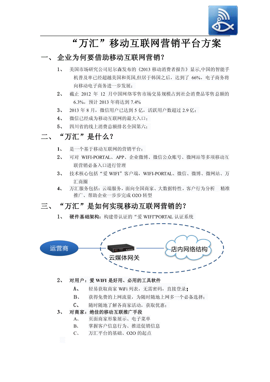 “万汇”移动互联网营销平台方案“万汇”移动互联网营销平台方案 一、 企业为何要借助移动互联网营销? 一、 企业为何要借助移动互联网营销? 1、1、 美国市场研究公司尼尔森发布的《2013 移动消费者报告》显示,中国的智能普及率已经超越美国和英国,但居于韩国之后,达到了 66%,电子商务将向移动电子商务进一步发展; 2、2、 截止 2012 年 12 月中国网络零售市场交易规模占到社会消费品零售总额的6.3%,预计 2013 年将达到 7.4% 3、3、 2013 年 8 月,用户已达到 5 亿,活跃用户数超过 2.9 亿; 4、4、 已经成为移动互联网的最大入口; 5、5、 四川省的线上消费总额排名全国第六; 二、 “万汇”是什么? 二、 “万汇”是什么? 1、、 是一个基于移动互联网的营销平台; 2、2、 可对 WIFI-PORTAL、APP、企业微博、公众账号、微网站等多项移动互联营销必备入口进行管理 3、3、 技术核心包括“爱 WIFI”客户端,WIFI-PORTAL、、微博、微网站、万汇商圈 4、、 万汇服务包括:云端服务,面向全国商家、大数据特性,客户行为分析 精准 推广、帮助企业一步步完成 O2O 转型 三、 “万汇”是如何实现移动互联网营销的? 三、 “万汇”是如何实现移动互联网营销的? 1、1、 硬件基础架构:硬件基础架构:构建带认证的“爱 WIFI”PORTAL 认证系统 2、2、 对用户:爱对用户:爱 WIFI 是好用、必用的工具软件是好用、必用的工具软件 A、A、 轻易获取商家 WiFi 列表,无需密码,直接登录; ; B、 获得免费的上网流量,为随时随地上网多一个必备选择; C、C、 随时随地了解各商家活动,获取优惠; 3、、 对商家:绝佳的移动互联推广手段对商家:绝佳的移动互联推广手段 A、 页面商家形象展示、电子菜单 B、 掌握客户信息行为、推送促销信息 C、 万汇平台的基础、O2O 的起点 四、 案例 四、 案例 客户上网更方便客户上网更方便 形象展示 服务展示 首页皮肤为商家页面 把商家装进客户 一键拨打 导航到店 信息推送 揽客进店 形象展示 服务展示 首页皮肤为商家页面 把商家装进客户 一键拨打 导航到店 信息推送 揽客进店 WiFi 免费上网 安装数量多 实惠方便 传播面广 使用频率高 推广更有效WiFi 免费上网 安装数量多 实惠方便 传播面广 使用频率高 推广更有效 五、 界面展示 六、 后台系统支持 五、 界面展示 六、 后台系统支持 1、部署于云端的后台系统 + 24 小时服务 2、查询、统计、分析数据、信息更方便 3、今天有多少客户登录、查看微网站;给登录过的客户推送促销信息;给附近的人 发布活动信息 七、 商家联盟 七、 商家联盟 1、 加入商家联盟,在其他商家店内的 WiFi,推荐和推广你; 2、 加入大商圈 ,在更大的商圈和人流内推广你,为你导流; 3、 20 多个大商圈,构建了每月百万人次的推广平台,人流即信息流消费流; 4、 举例:举例:良木缘商圈登录 10000 人次/每天, 诺亚方舟商圈登录 3000 人次/每天, 兰桂坊商圈登录 2000 人次/每天, 大蓉和商圈登录 2000 人次/每天, 鹭岛地域商圈登录 5000 人次/每天 。